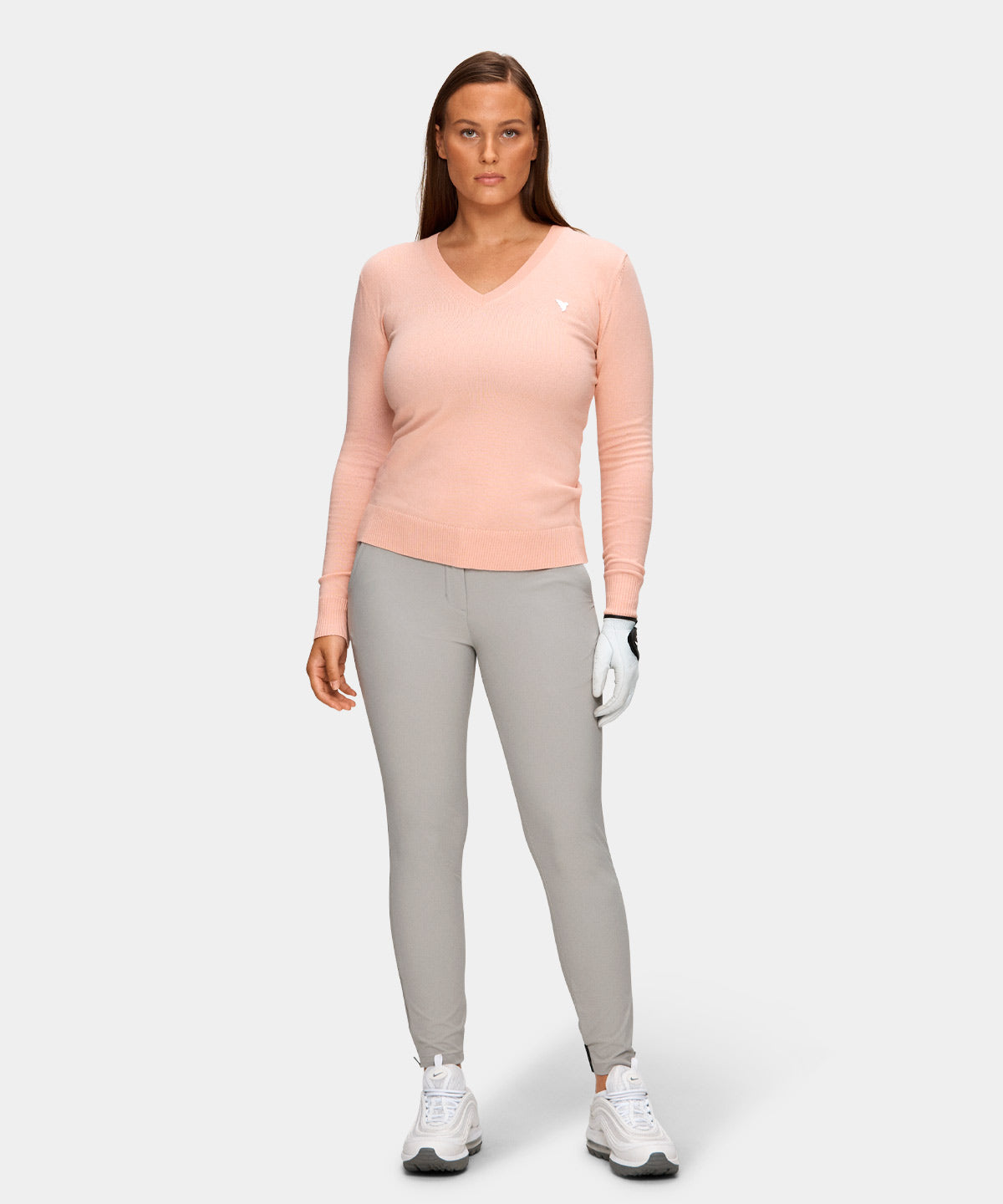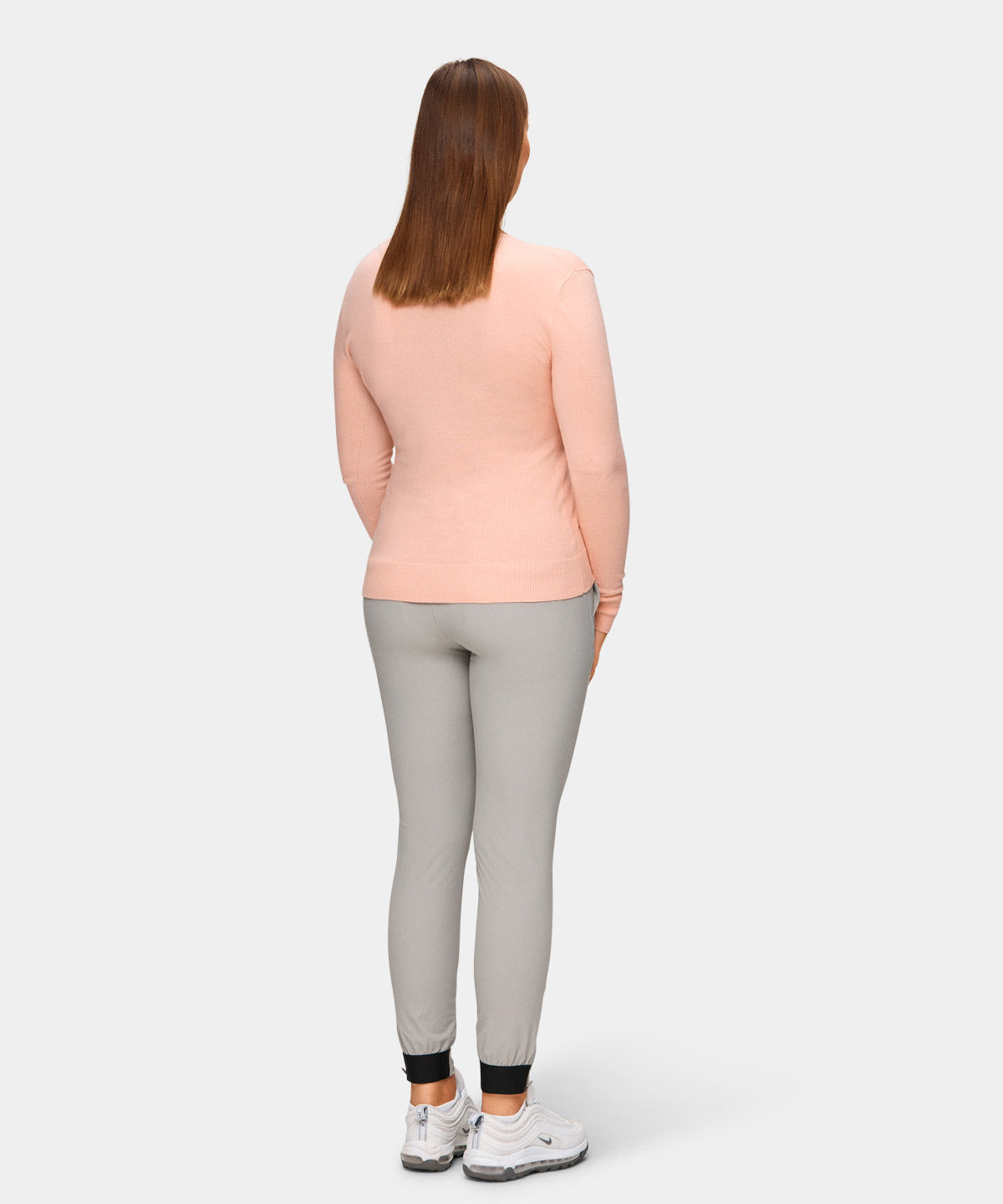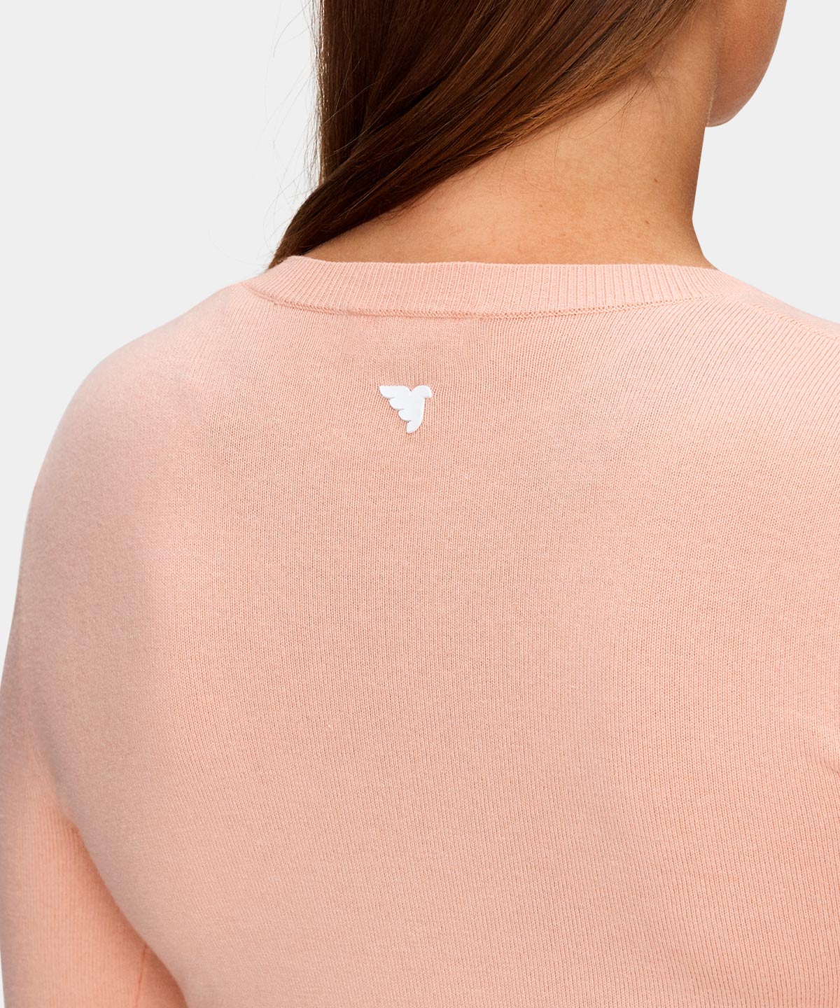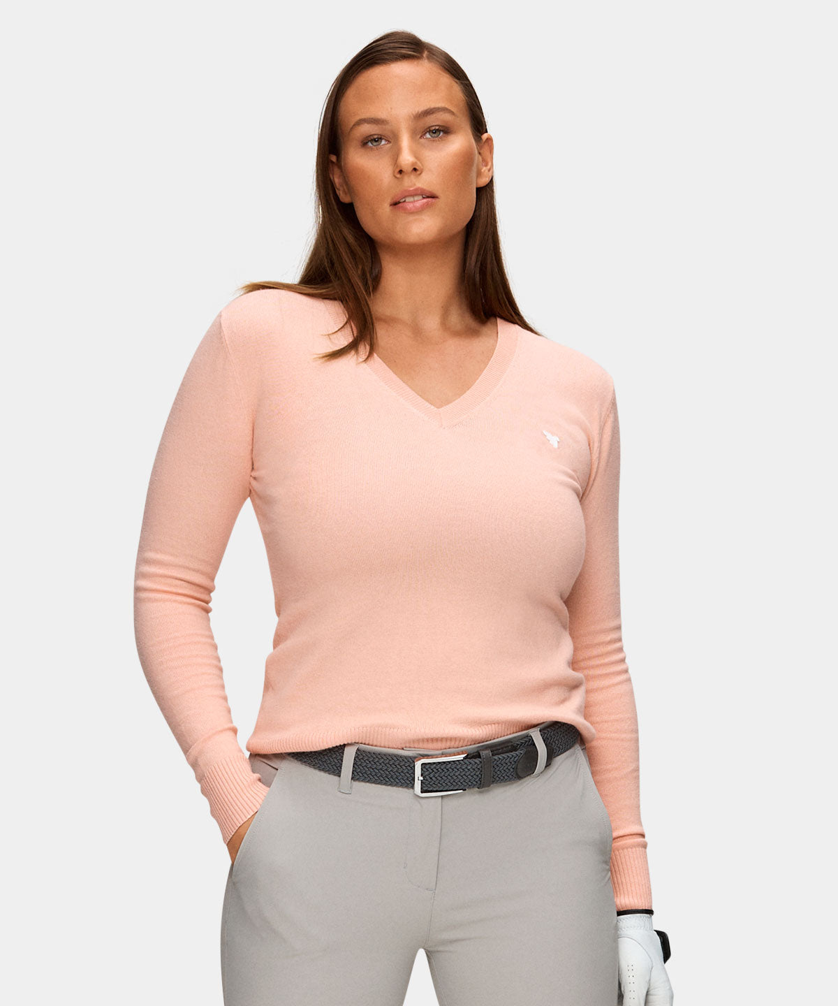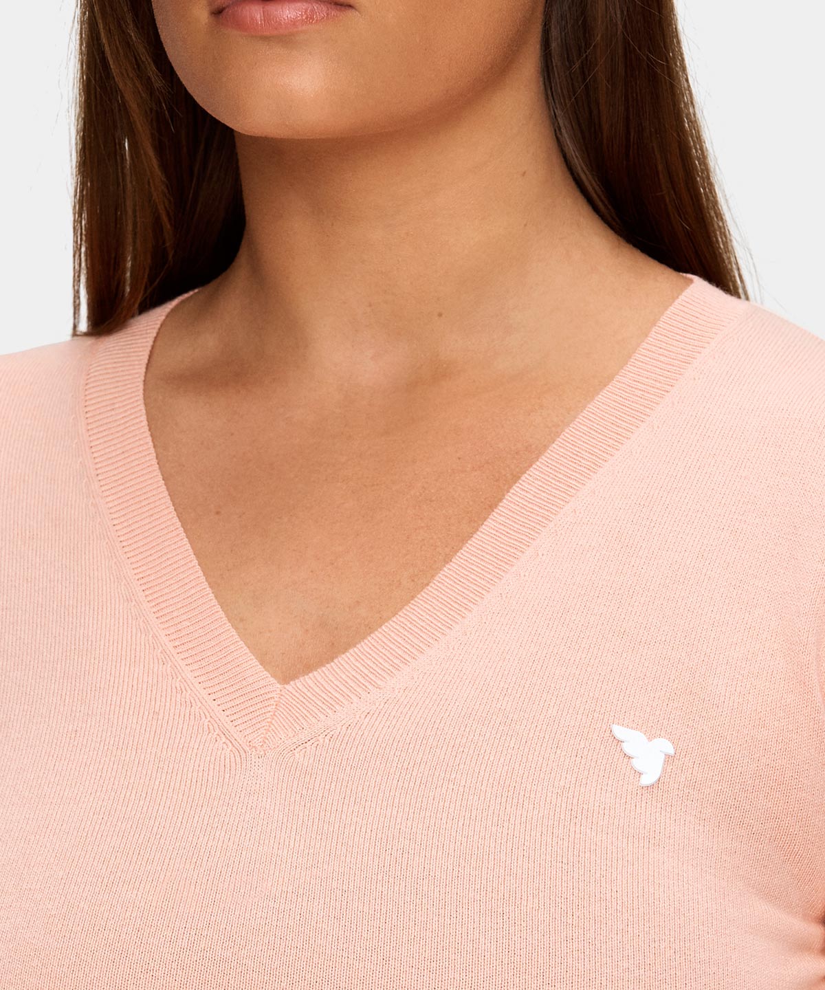 Denna mångsidiga aprikosfärgade tröja är stickad i en blandning av lätt borstad bomull och viskos, vilket gör den både exceptionellt mjuk och stretchig. Den klassiskt v-ringade halsen gör att denna tröja passar utmärkt att bära både med och utan piké under. Utrustad med detaljer som subtila vita gummibaserade tryck och ribbade ärmslut.