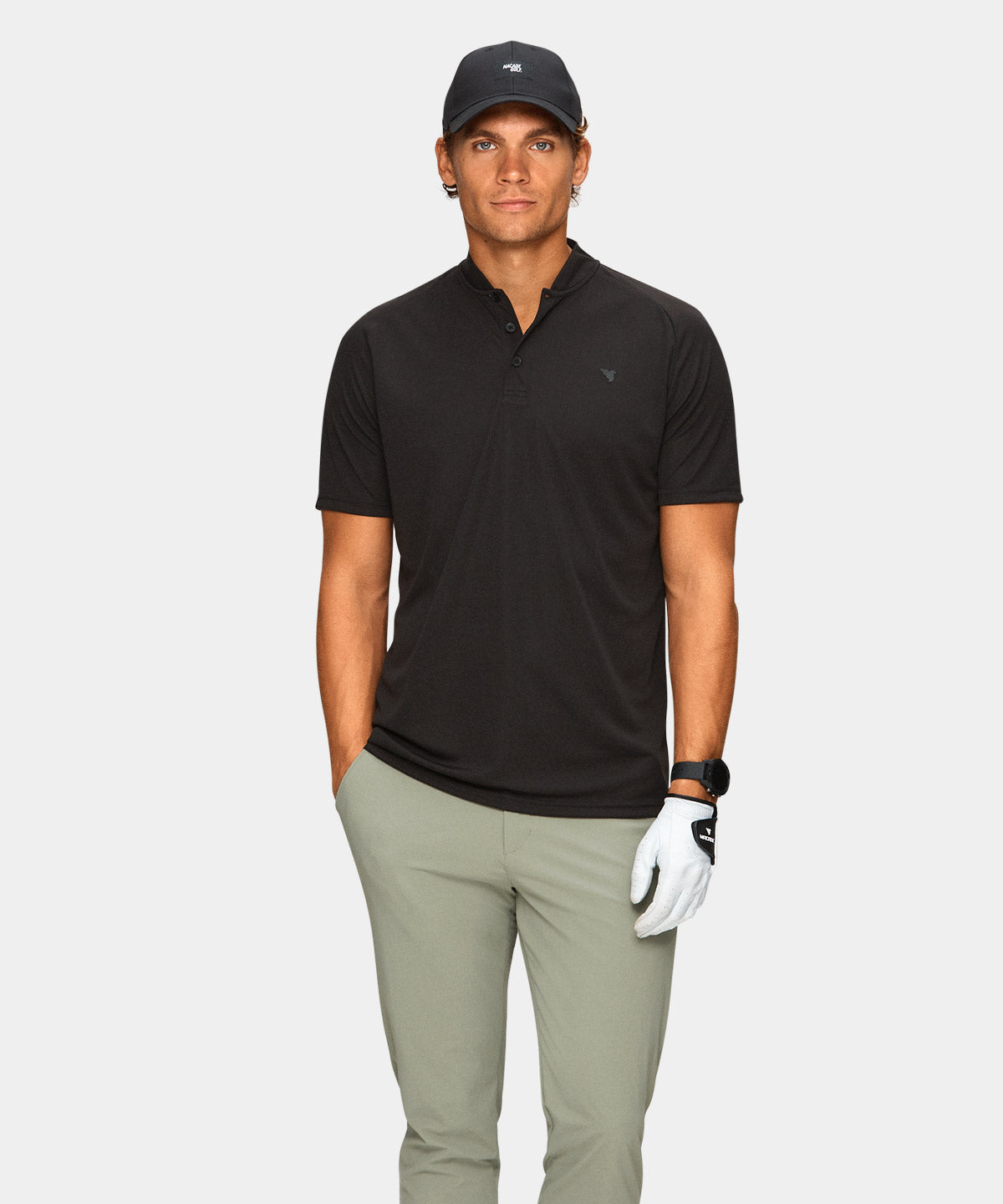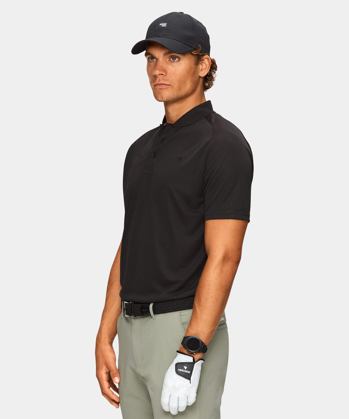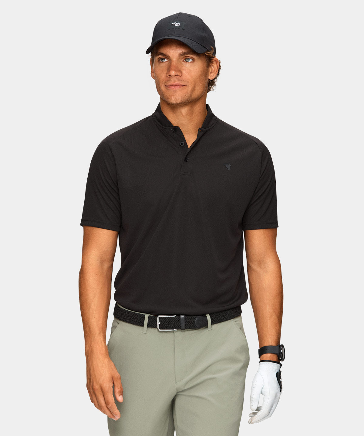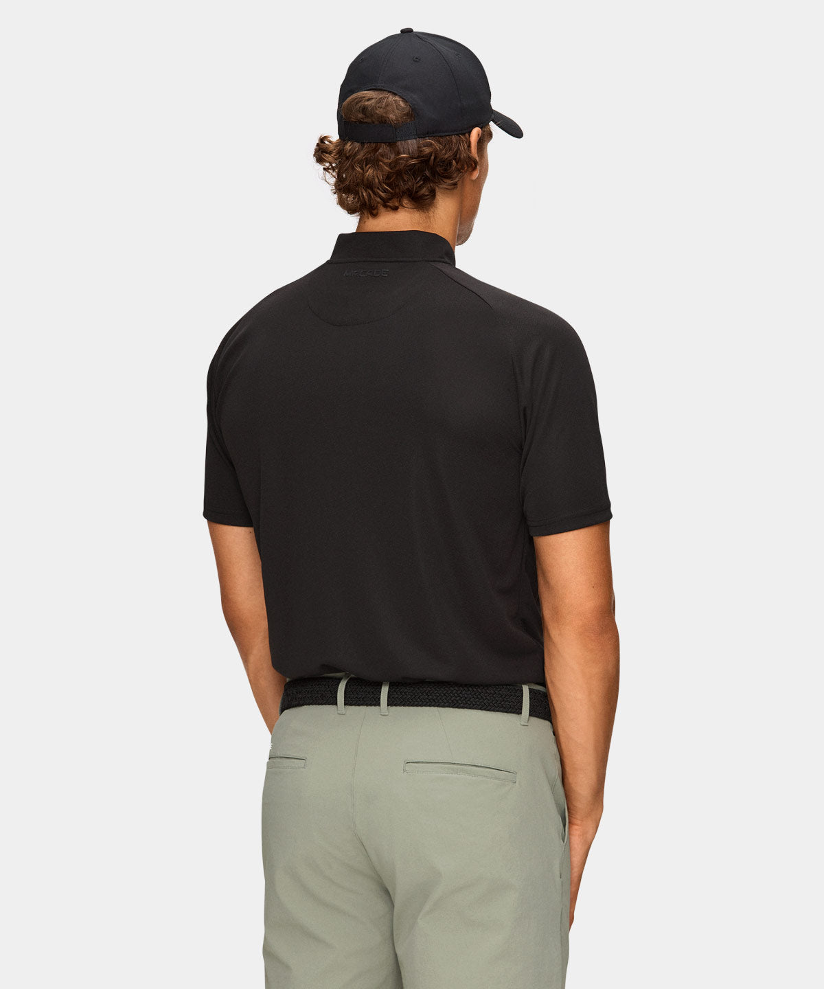 Helsvart golfpiké i funktionstyg med hög andningsförmåga och tvåvägsstretch. Den låga kragen ger denna piké ett sportigt utryck och gör den perfekt att bära under en tunn överdragströja i höst. Svarta gummibaserade logotryck på bröst och i nacke.