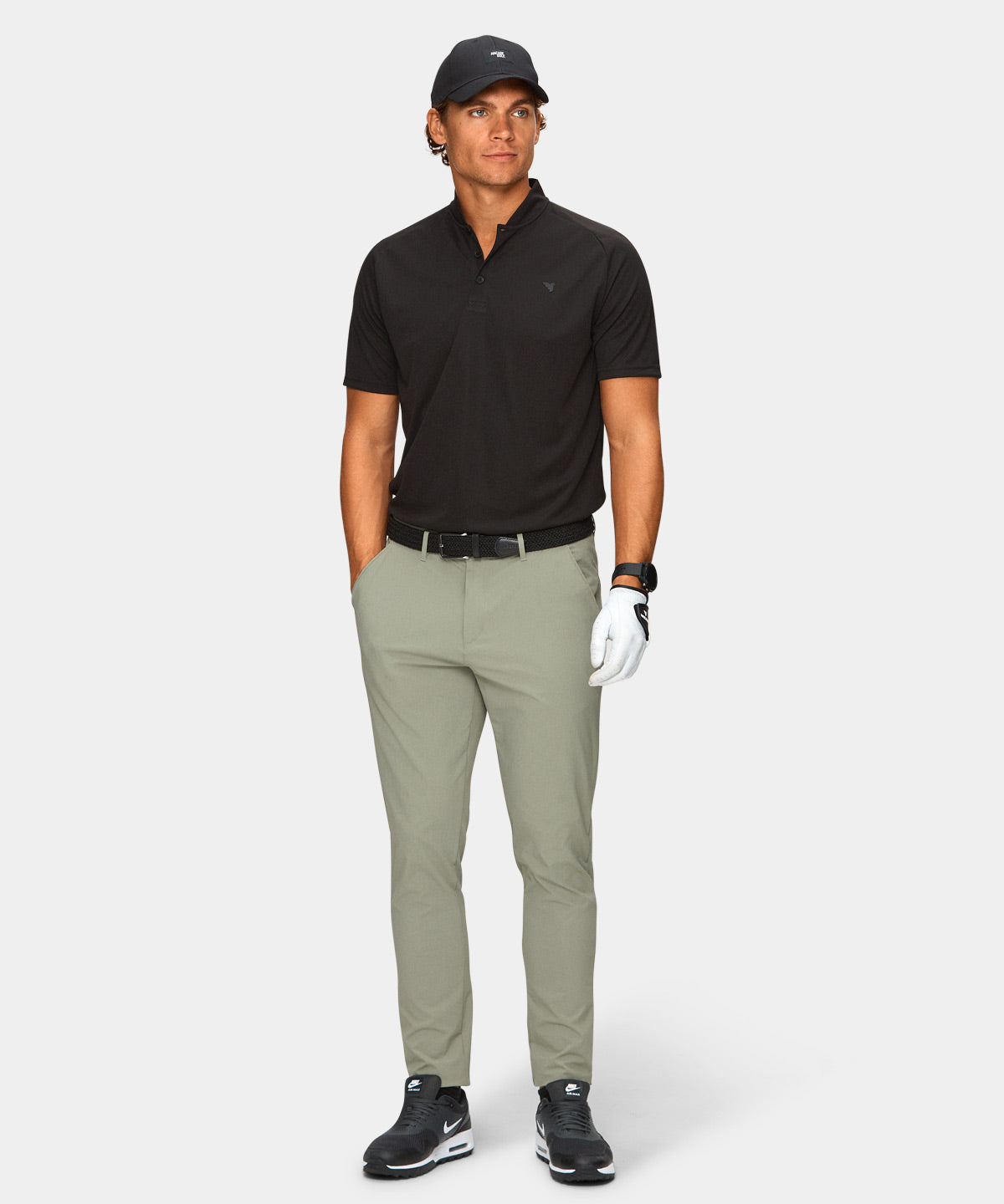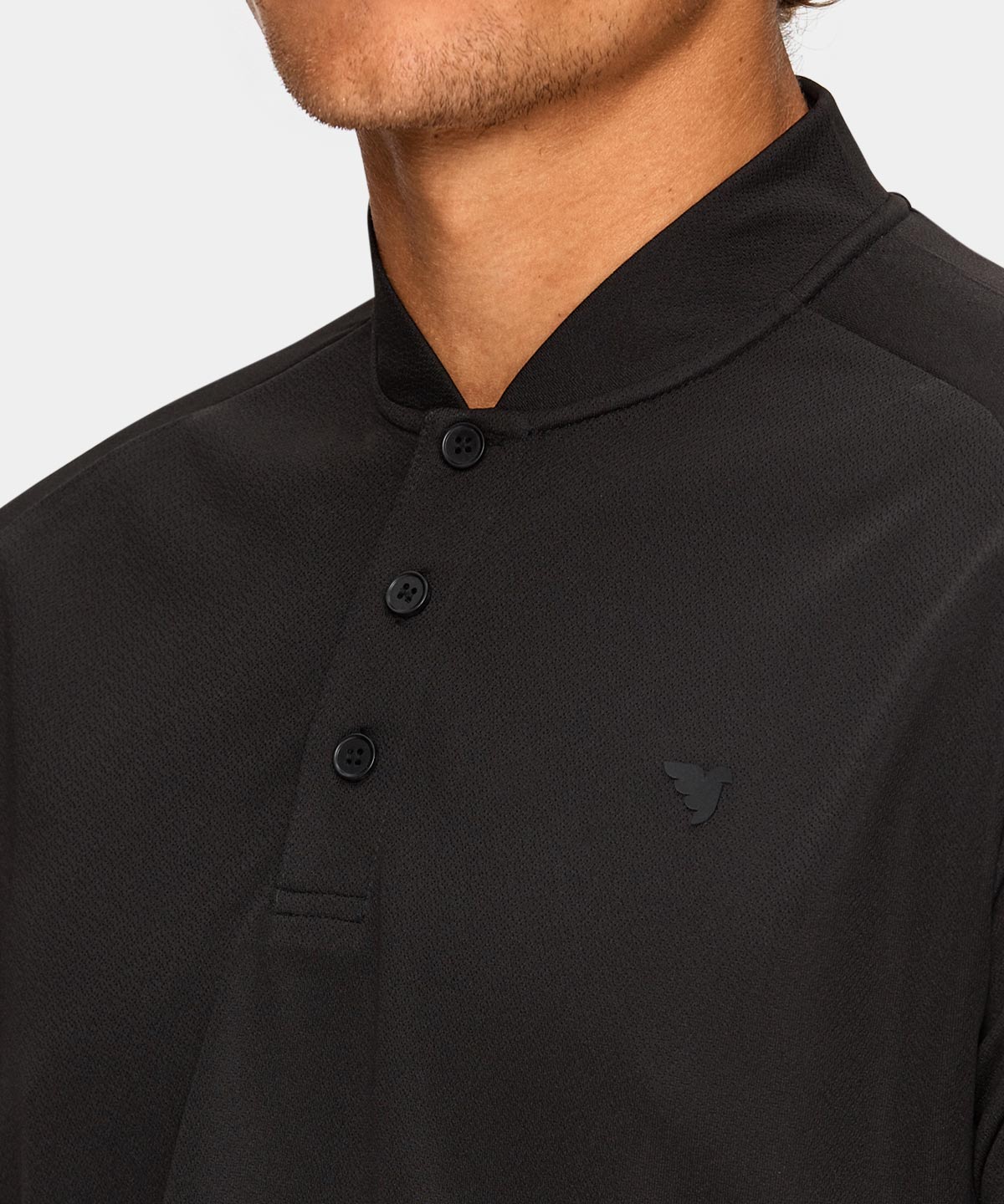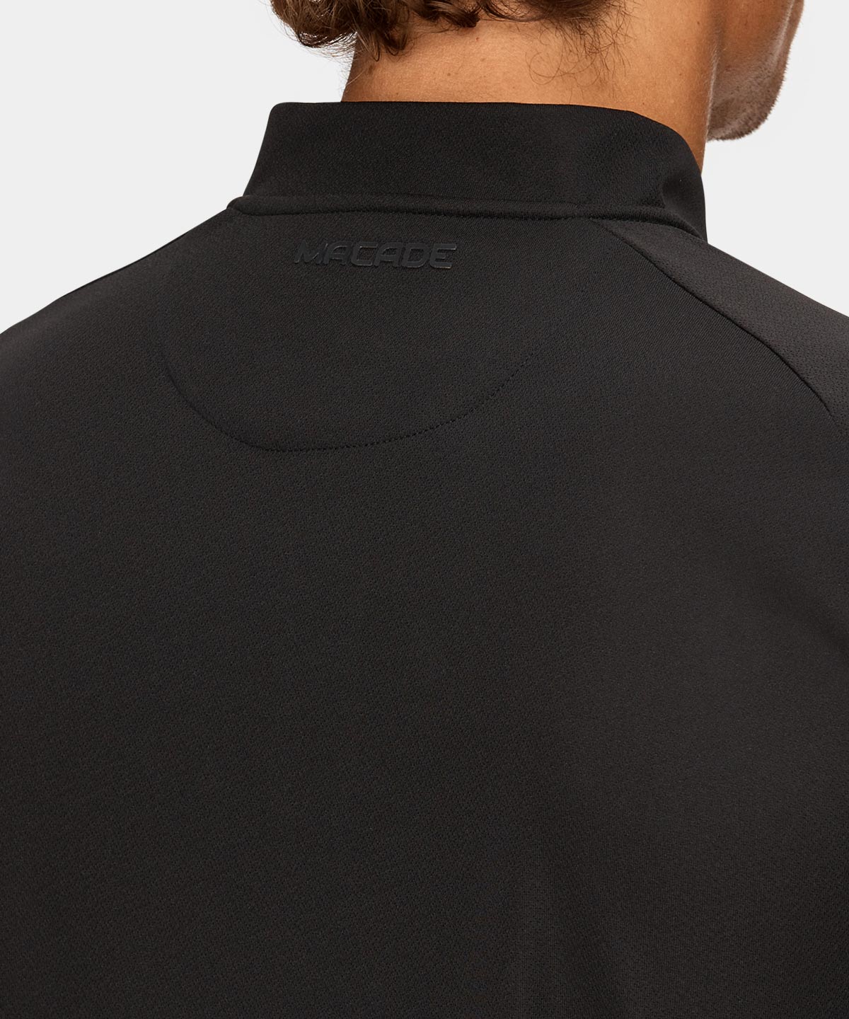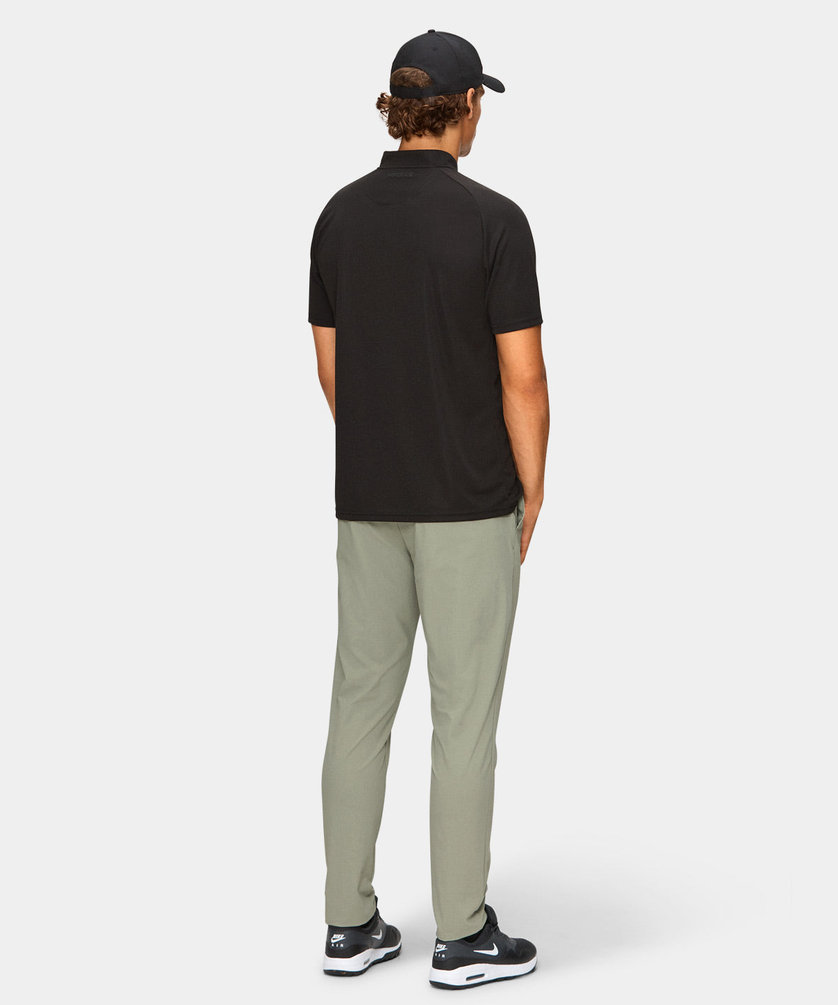 Helsvart golfpiké i funktionstyg med hög andningsförmåga och tvåvägsstretch. Den låga kragen ger denna piké ett sportigt utryck och gör den perfekt att bära under en tunn överdragströja i höst. Svarta gummibaserade logotryck på bröst och i nacke.