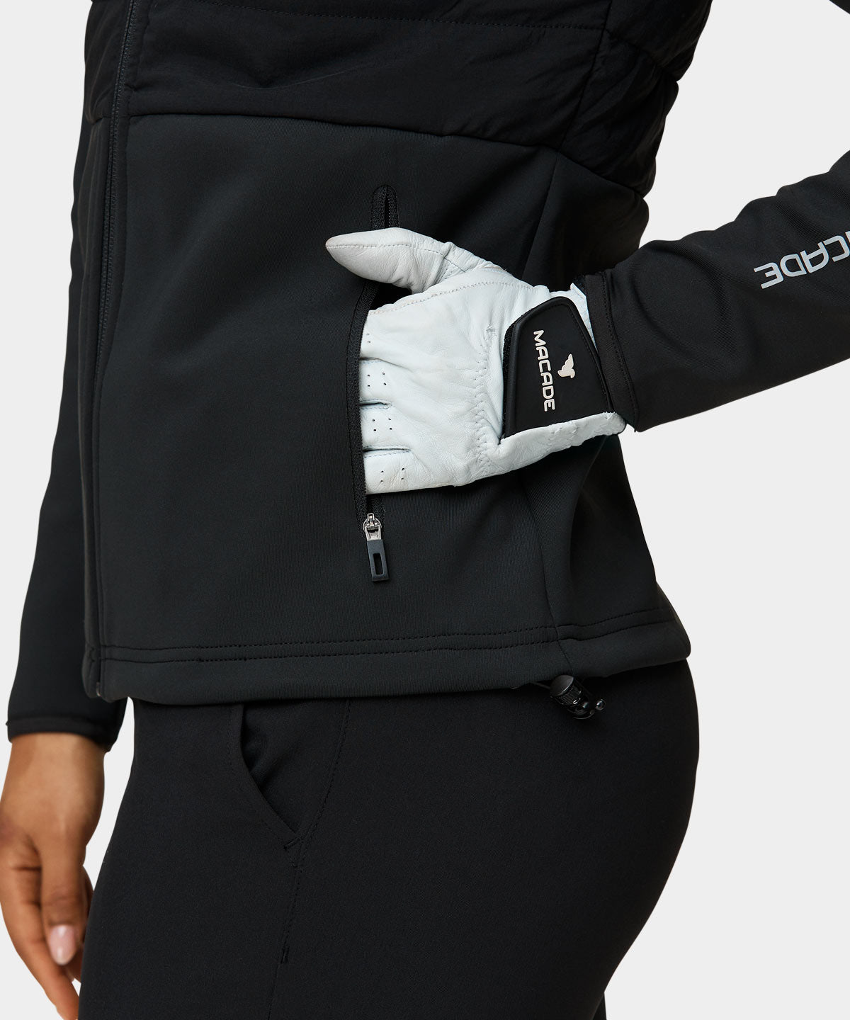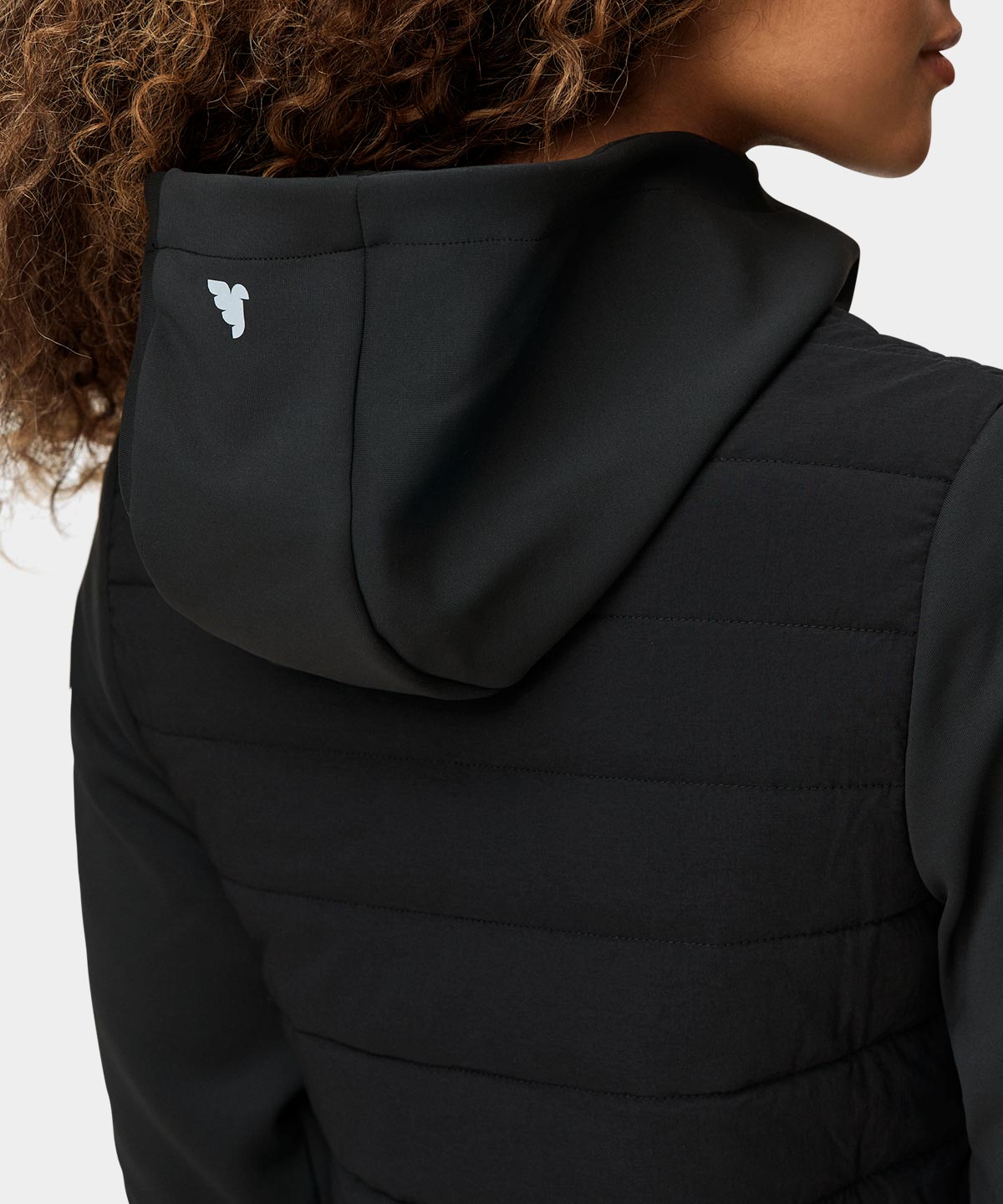 Denna svarta hybrid jacka med huva passar utmärkt för kallare vår och höstdagar på banan. Vadderad över bröstet och övre delen av ryggen för att hålla dig varm samt ett stretchigt jerseytyg med vindtäta egenskaper på resterande dela av jackan för vindskydd och utökad rörlighet. Jackan har två fickor framtill samt dragsko i midjan.