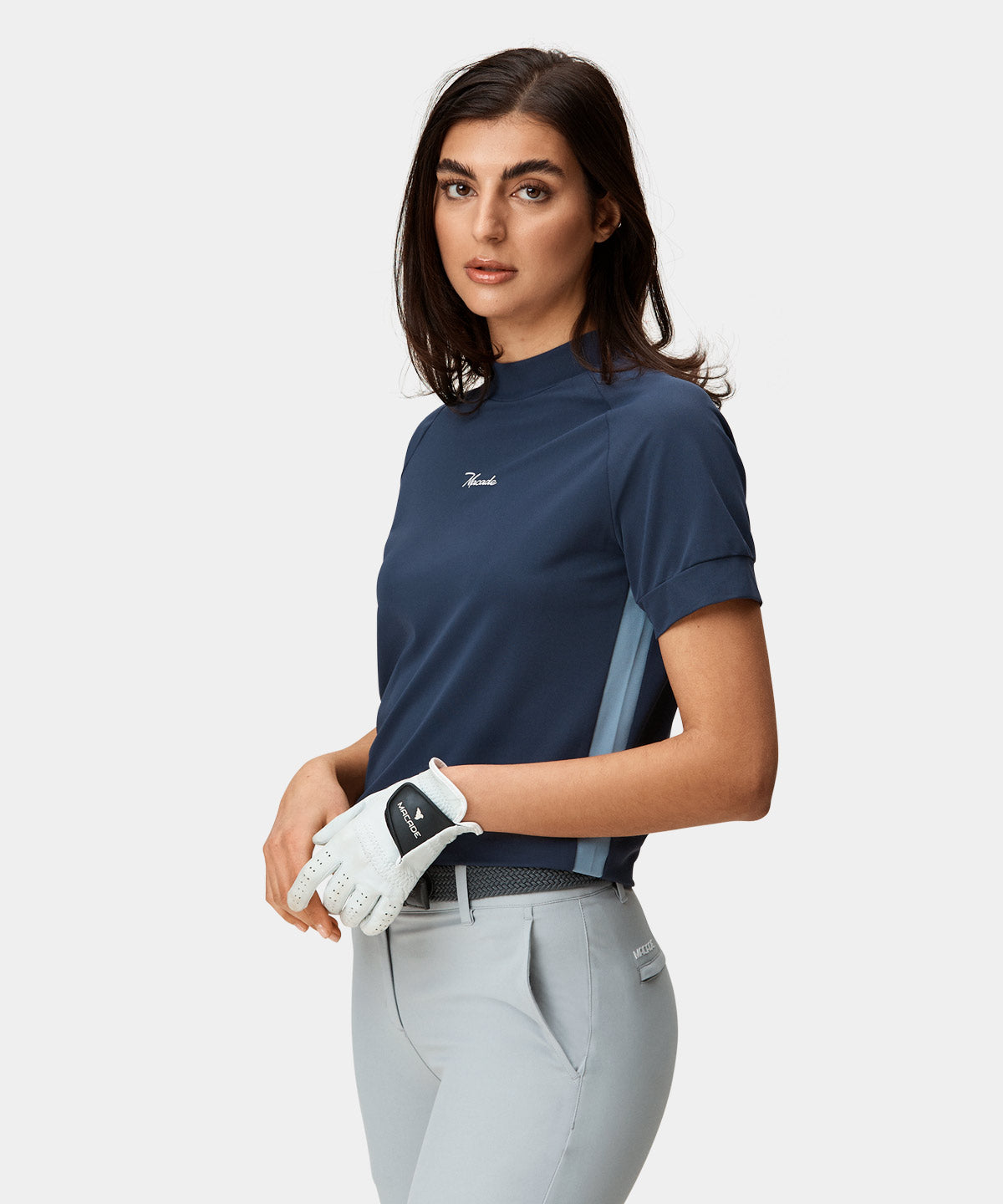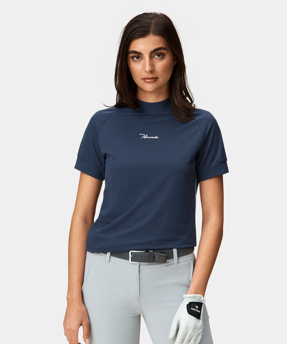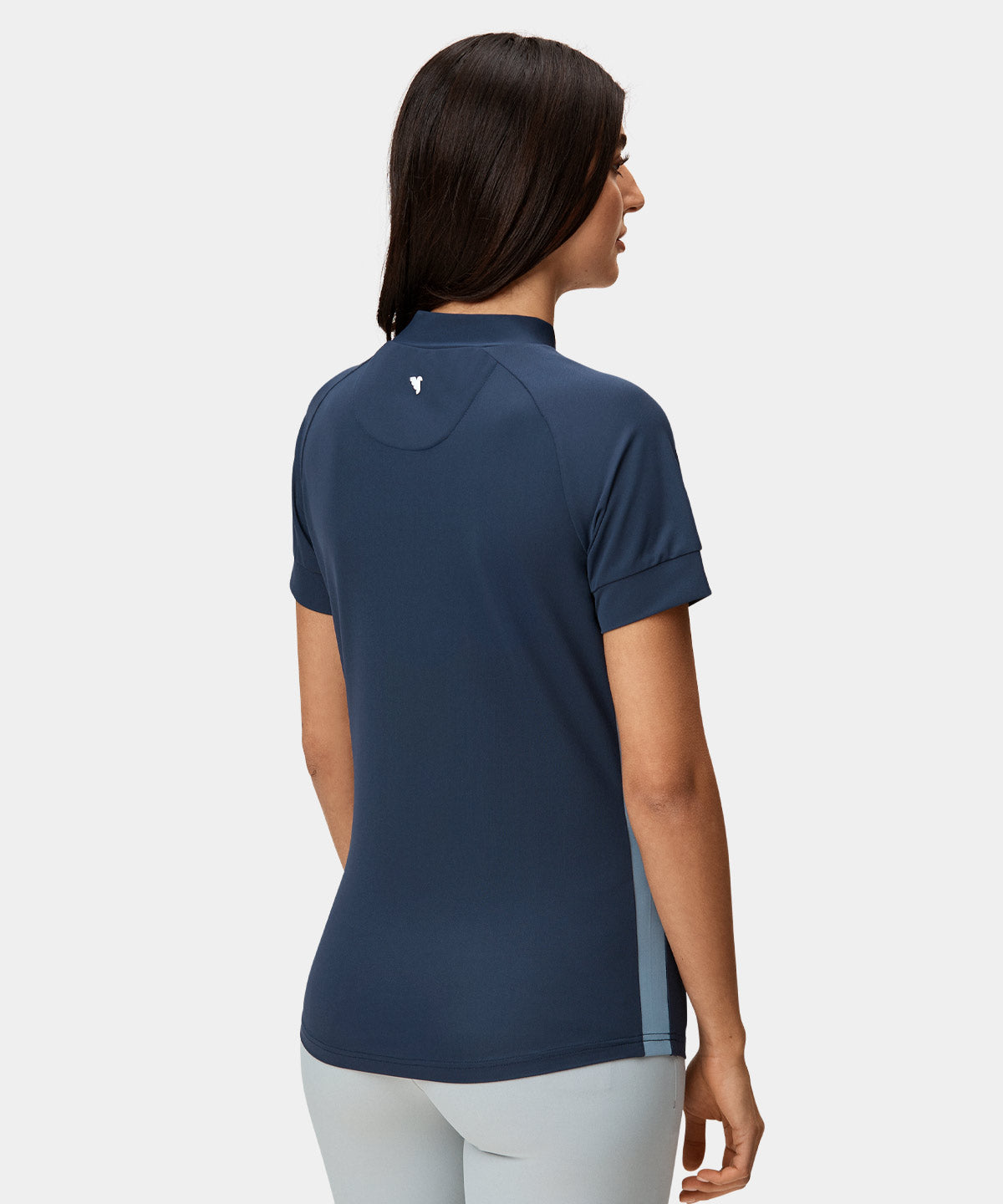 Ett modernt alternativ till den klassiska golfpikén. Denna mörkblå mock neck t-shirt har en något högre krage för en trendig och stilren look. De kontrasterande ränderna längs sidan och vita logotryck ger t-shirten ett sportigt utryck. Matcha gärna med en vit kjol eller ett par grå byxor.