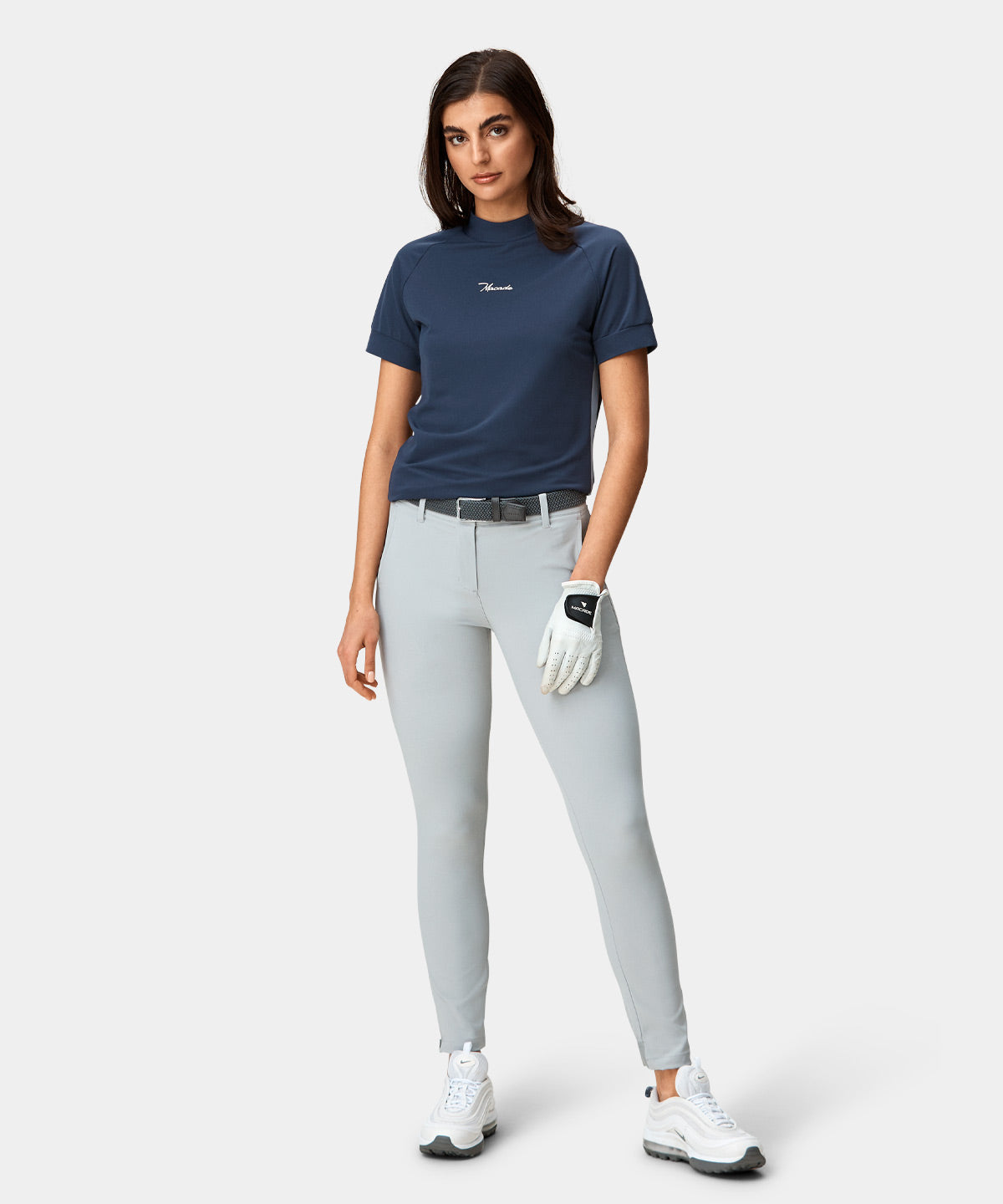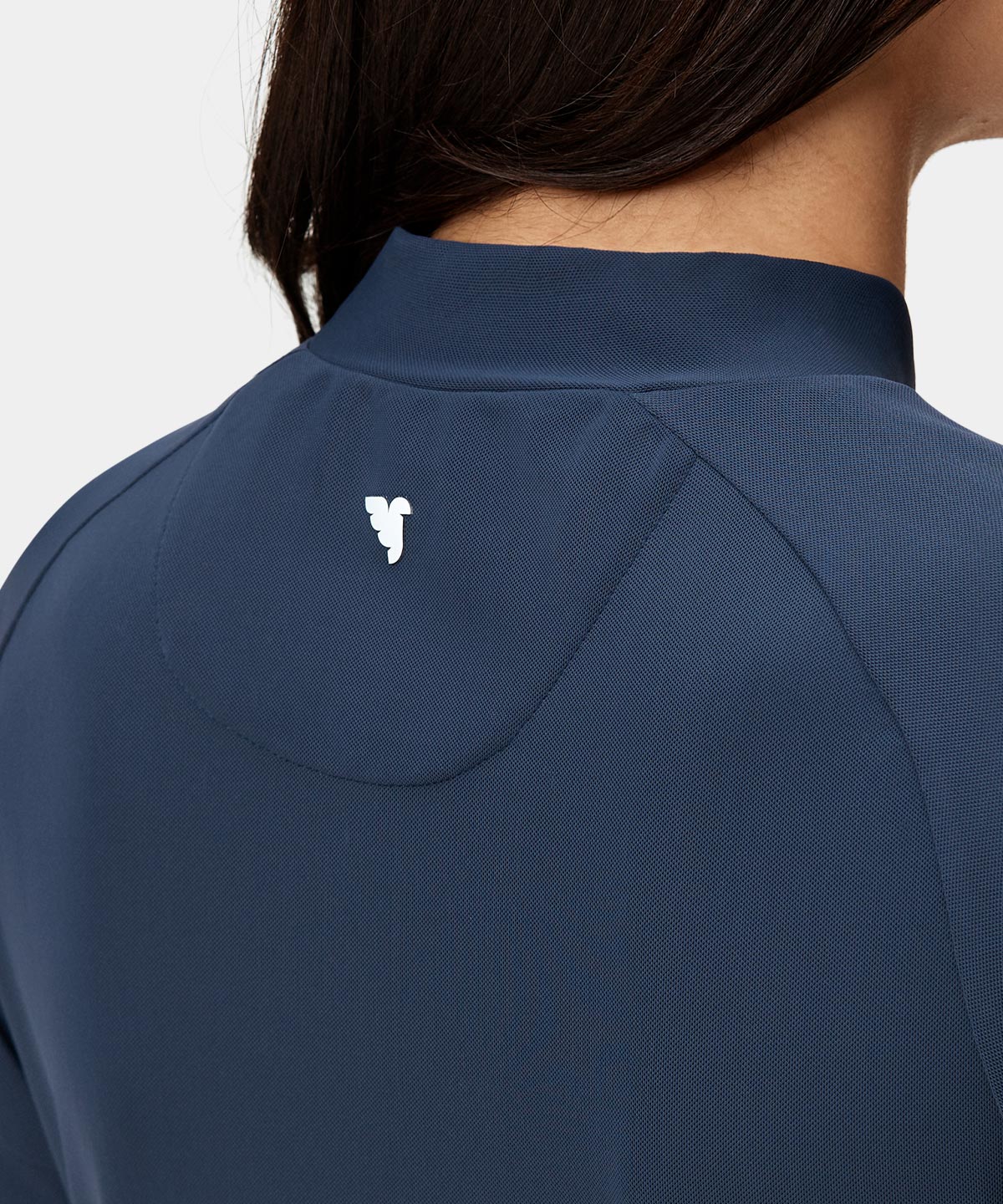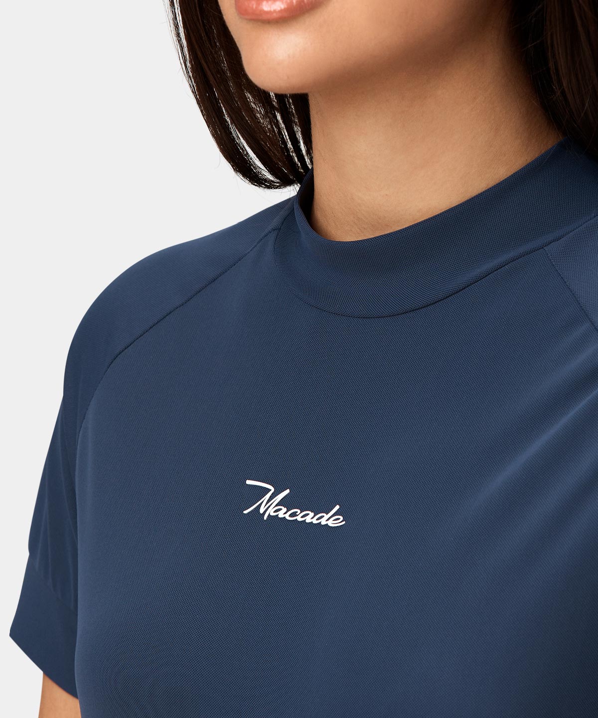 Ett modernt alternativ till den klassiska golfpikén. Denna mörkblå mock neck t-shirt har en något högre krage för en trendig och stilren look. De kontrasterande ränderna längs sidan och vita logotryck ger t-shirten ett sportigt utryck. Matcha gärna med en vit kjol eller ett par grå byxor.