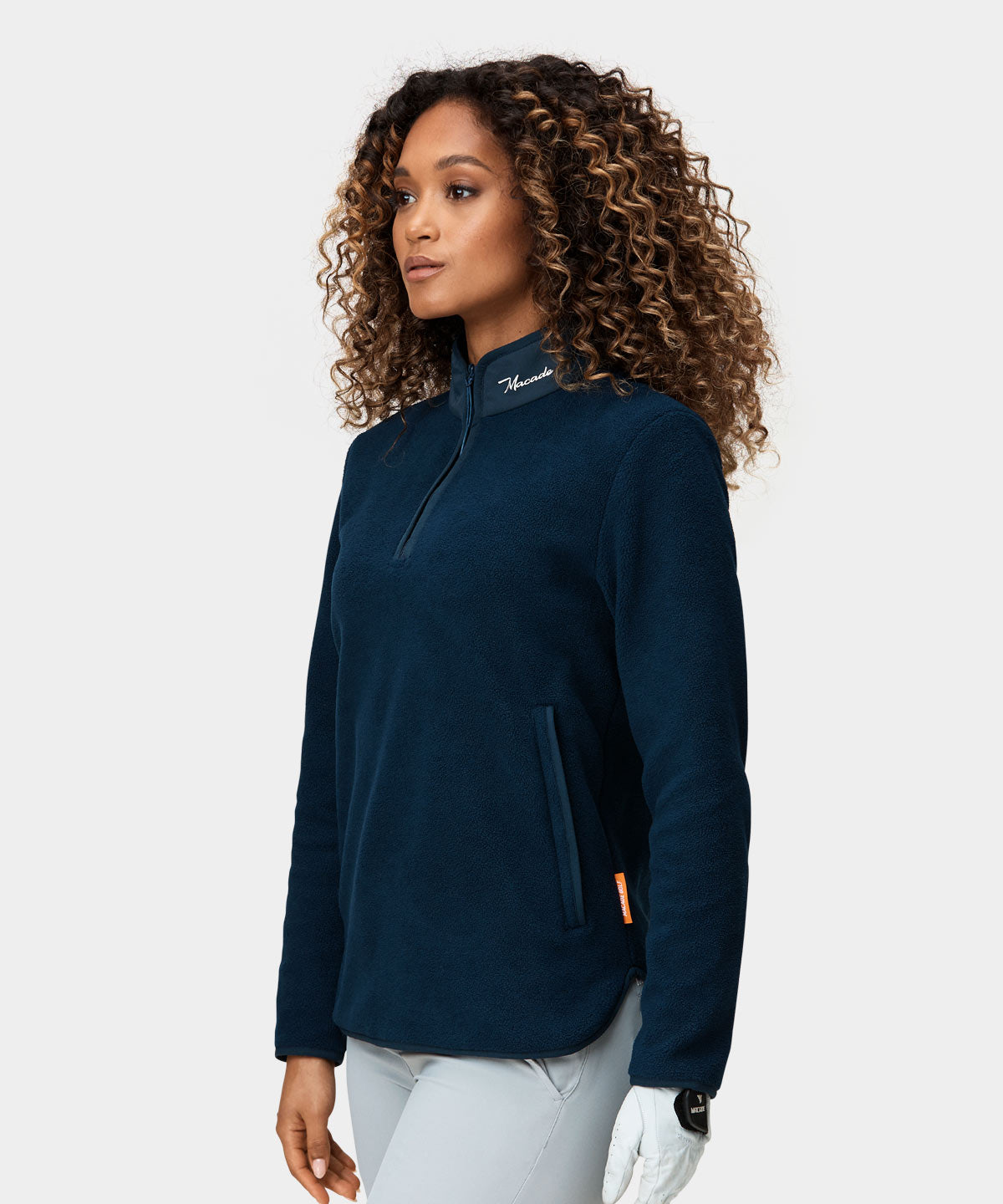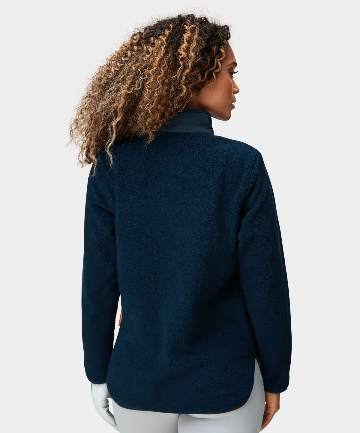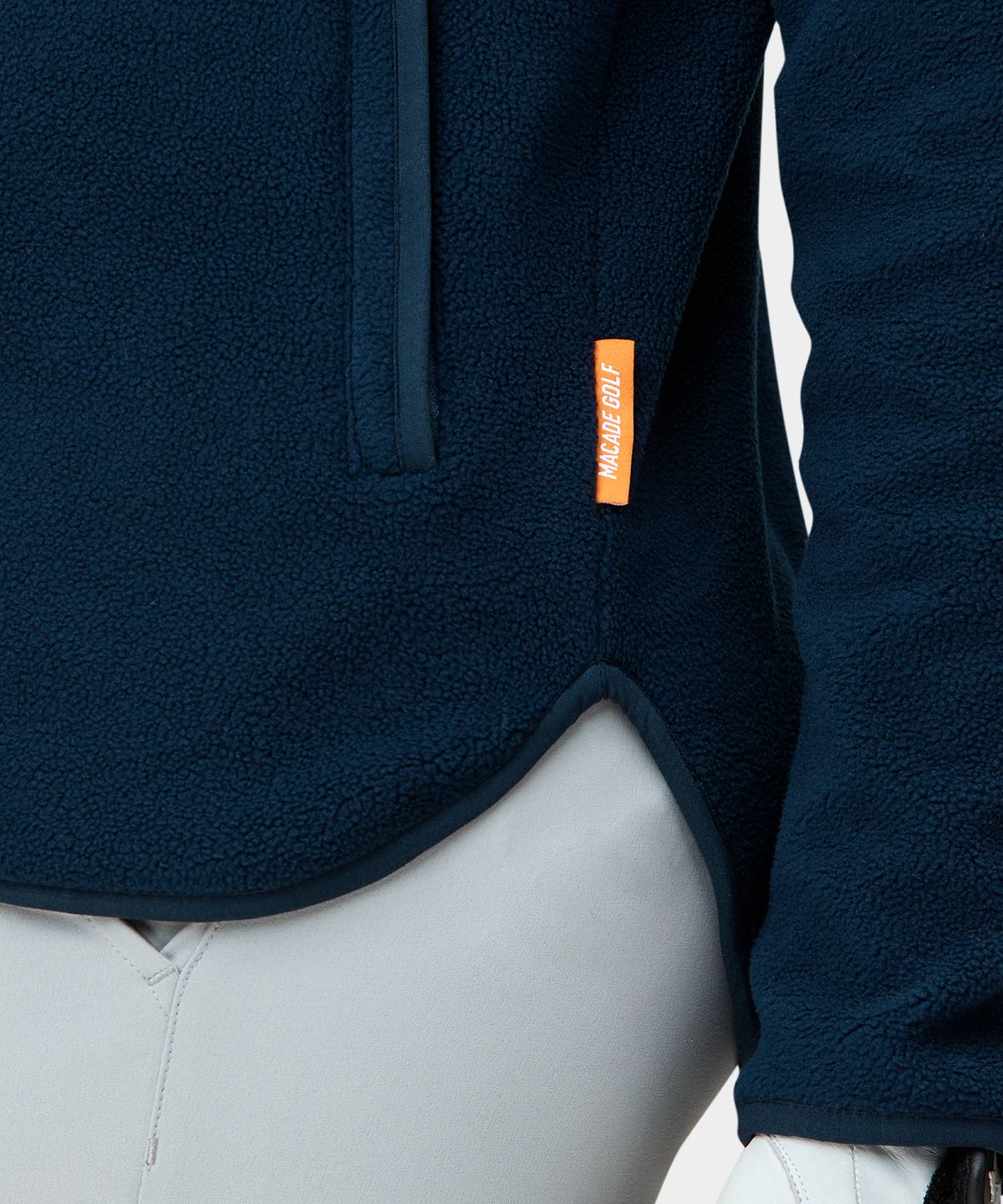 Denna mörkblå fleece är perfekt för kyligare dagar under vårens tidiga rundor. Tillverkad i en avslappnad och något längre passform för att enkelt bäras som ytterplagg. Fleecen har praktiska fickor framtill för att enkelt får plats med diverse väsentligheter som vi golfare kånkar runt på. De vita och orangea detaljerna skapar ett distinkt och sportigt uttryck mot den blå basen, bär din fleece med ett par ljusare byxor eller shorts för att fullända looken.