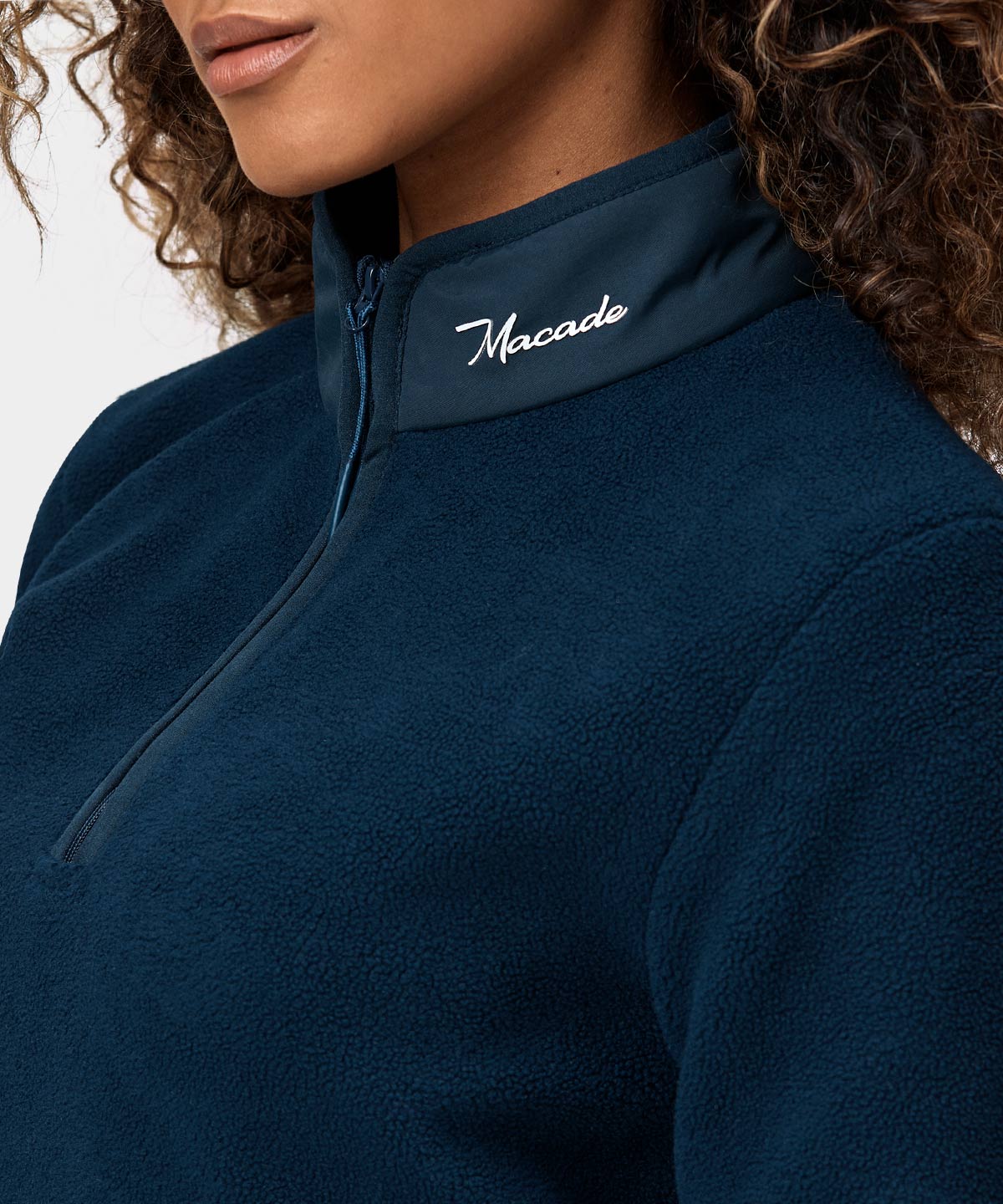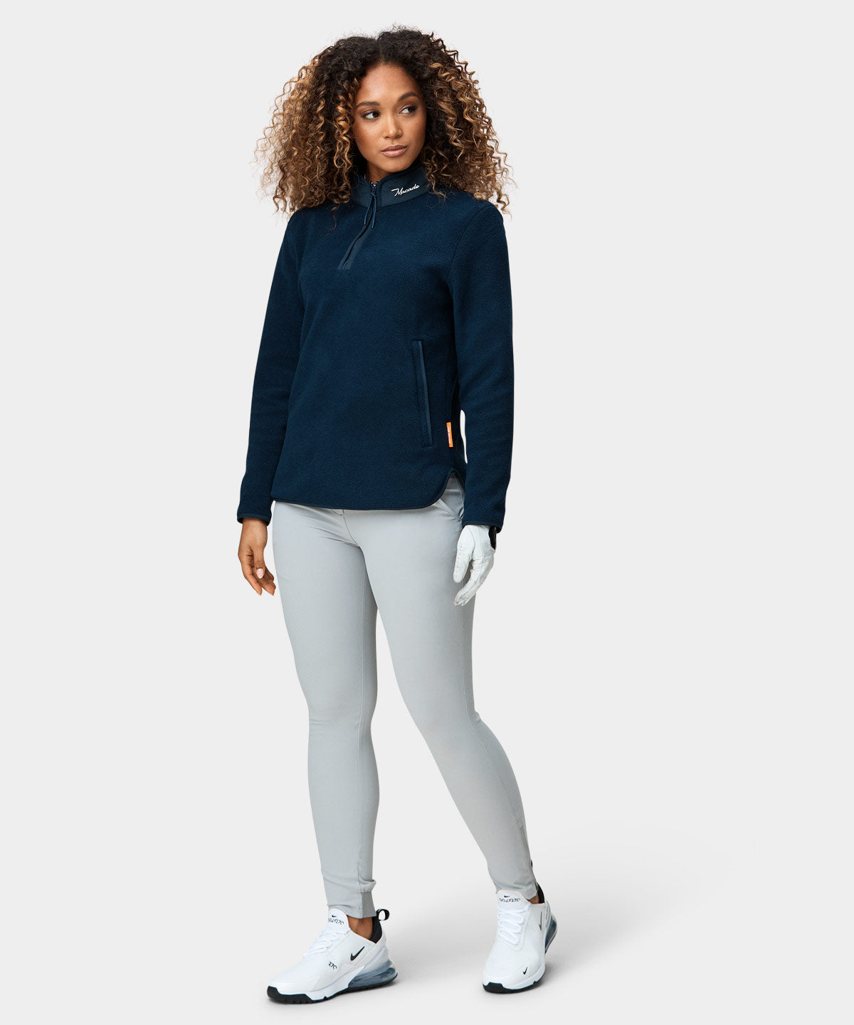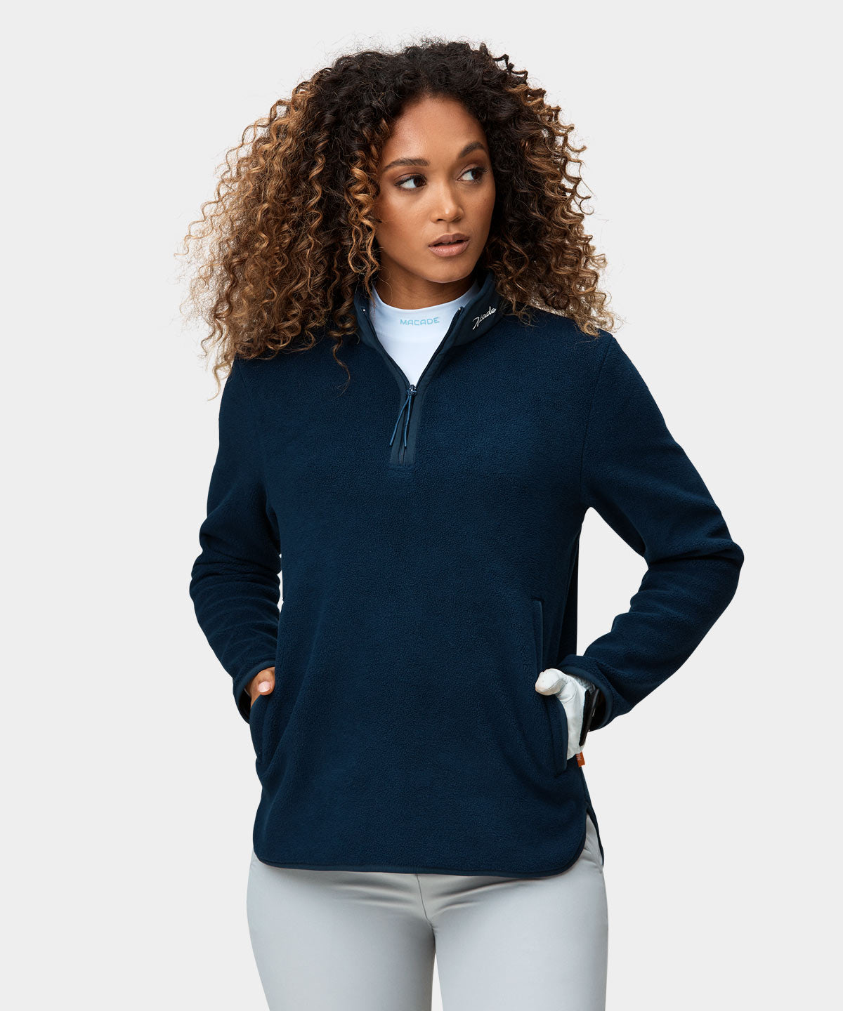 Denna mörkblå fleece är perfekt för kyligare dagar under vårens tidiga rundor. Tillverkad i en avslappnad och något längre passform för att enkelt bäras som ytterplagg. Fleecen har praktiska fickor framtill för att enkelt får plats med diverse väsentligheter som vi golfare kånkar runt på. De vita och orangea detaljerna skapar ett distinkt och sportigt uttryck mot den blå basen, bär din fleece med ett par ljusare byxor eller shorts för att fullända looken.