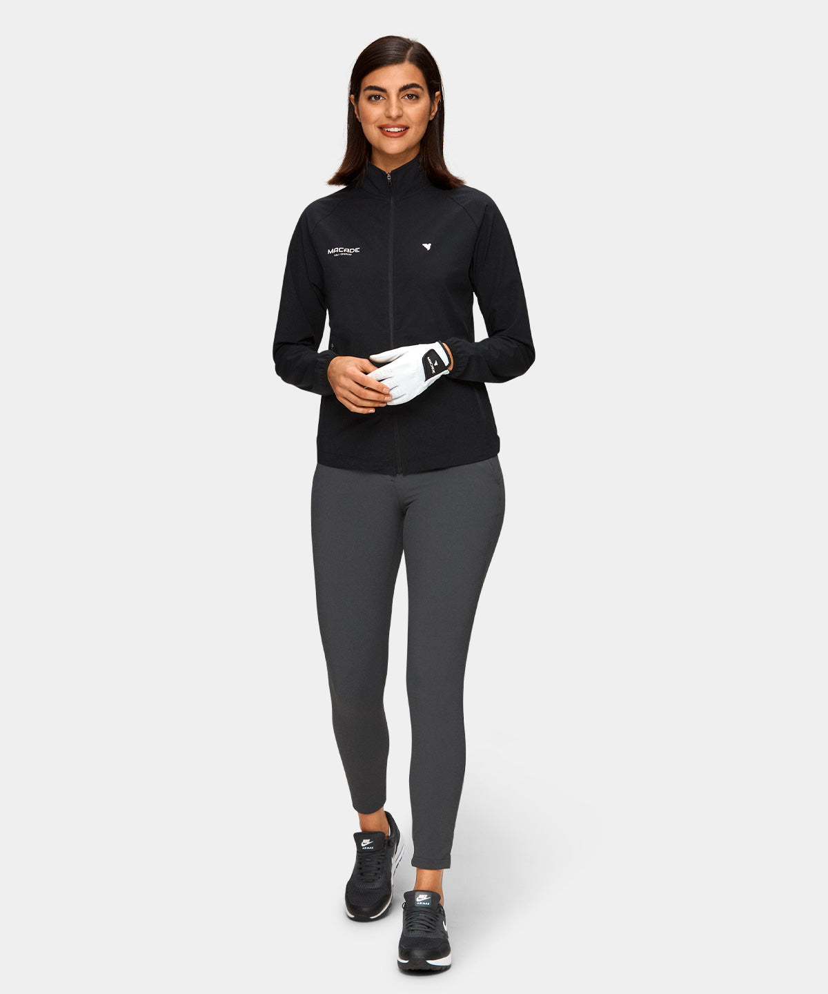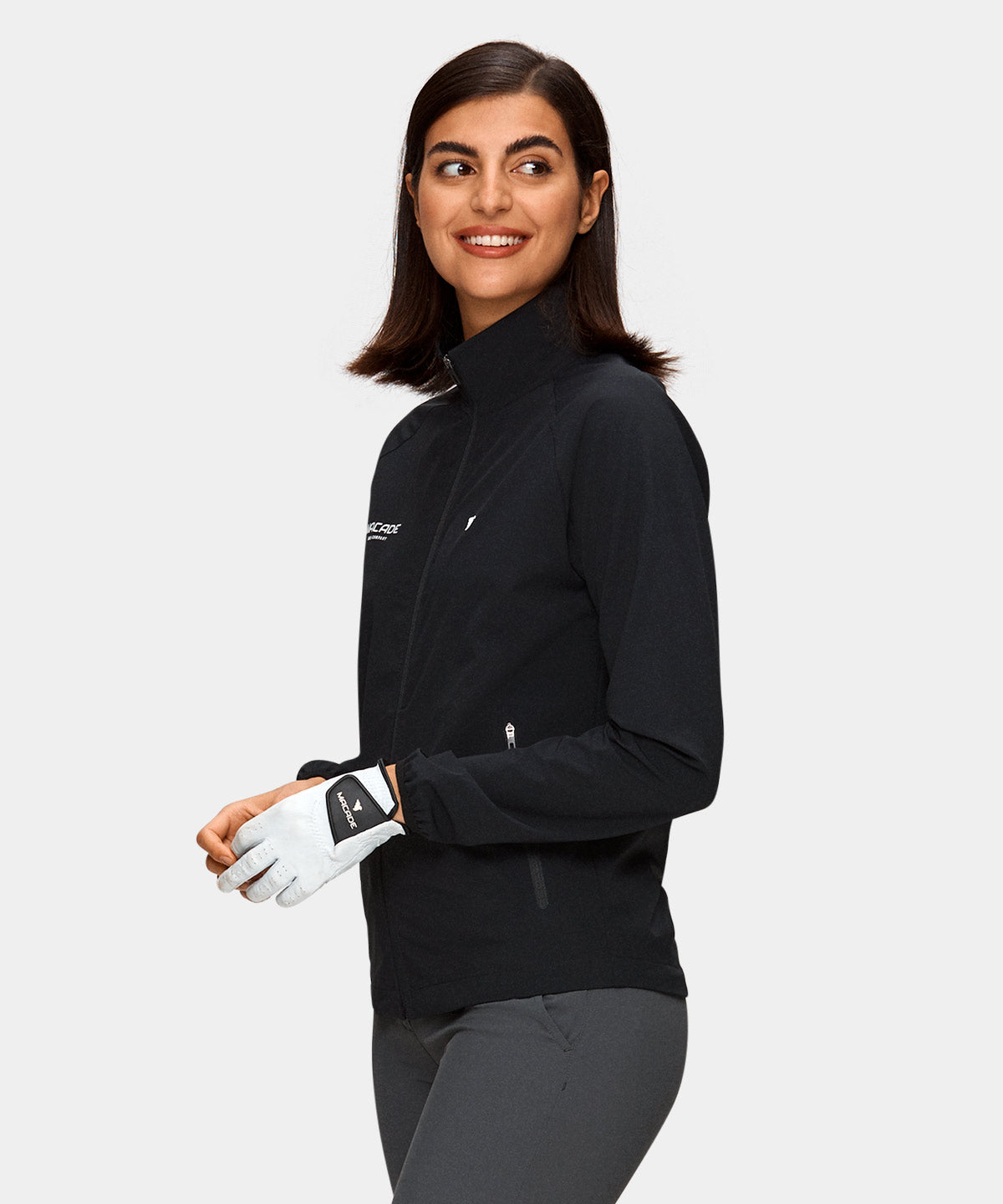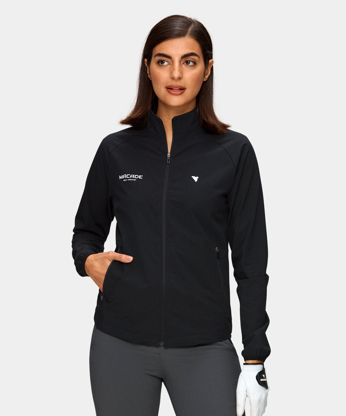 Svart mångsidig jacka som med stor sannolikhet kan bli ditt favoritval både under och efter rundan. Tillverkad i ett mjukt och lätt tyg med hög grad av stretch för ultimat rörelsefrihet. De elastiska ärmsluten och dragskon i midjan gör att denna vattenavvisande och vindavstötande jackan håller tätt även i blåsigt väder.