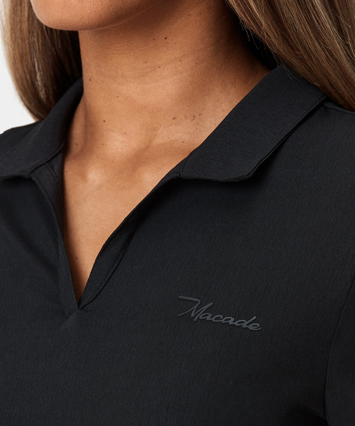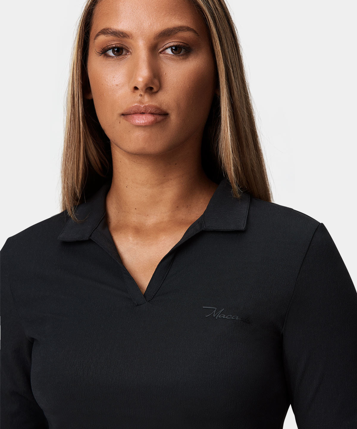 Den här svarta långärmade pikén är gjord i ett mjukt och stretchigt tyg för att möjliggöra så hög andningsförmåga och rörelseförmåga som möjligt. Den knapplösa v-ringningen ger pikén en sportig look.