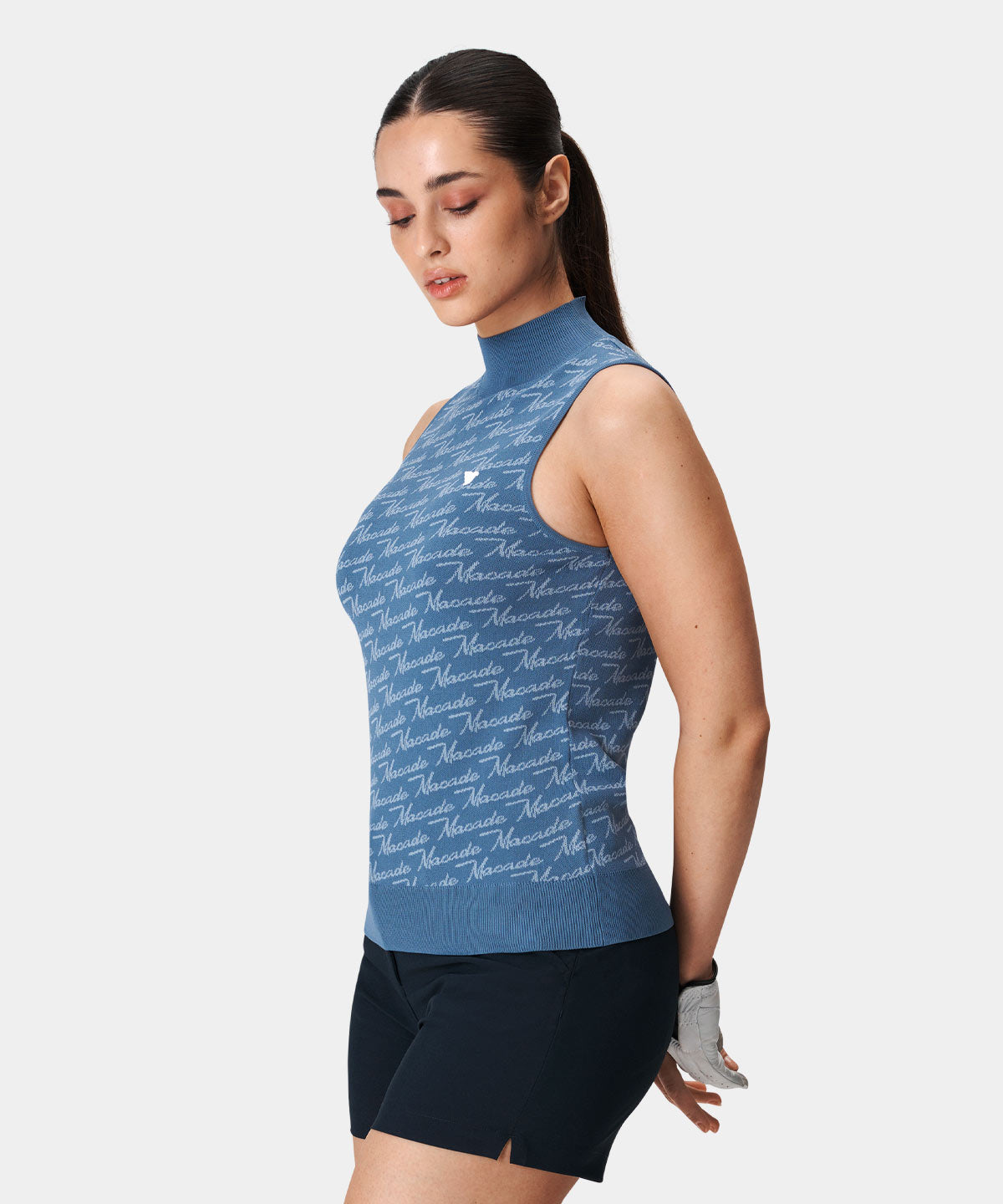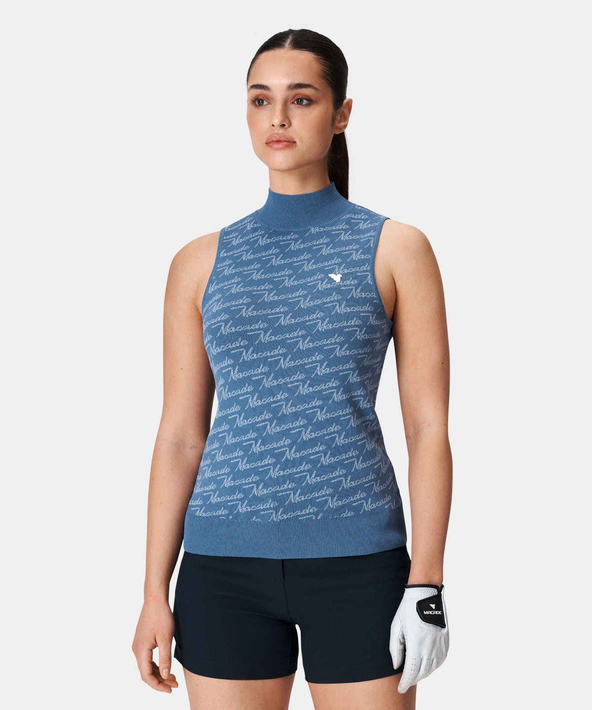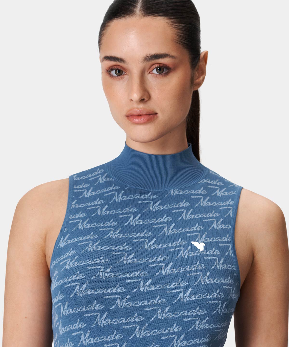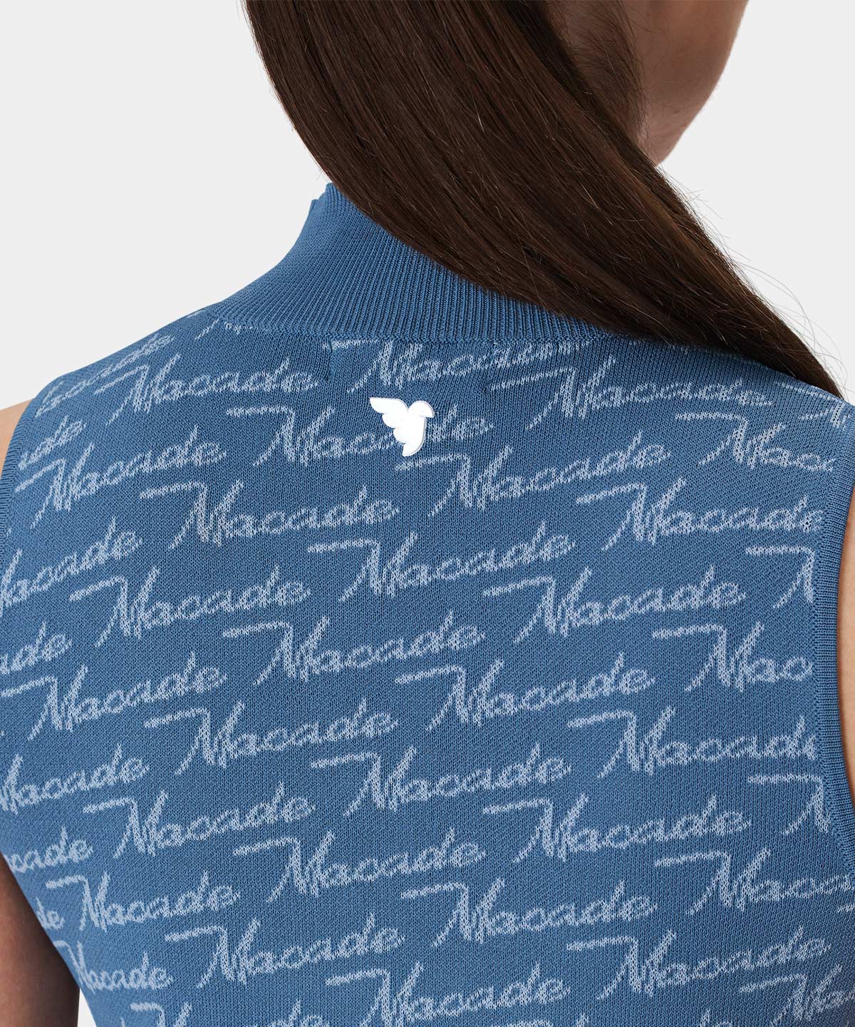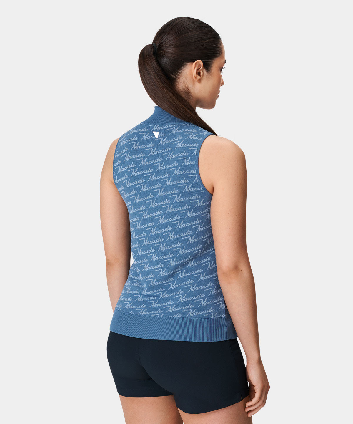 Denna blåa stickade tröja är tillverkad i en blandning av viskos och nylon, vilket gör den exceptionellt mjuk och bekväm att bära. Tröjan har en sportig, något högre krage, som håller dig varm under kallare dagar ute på banan.