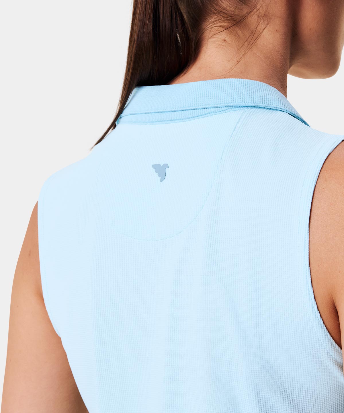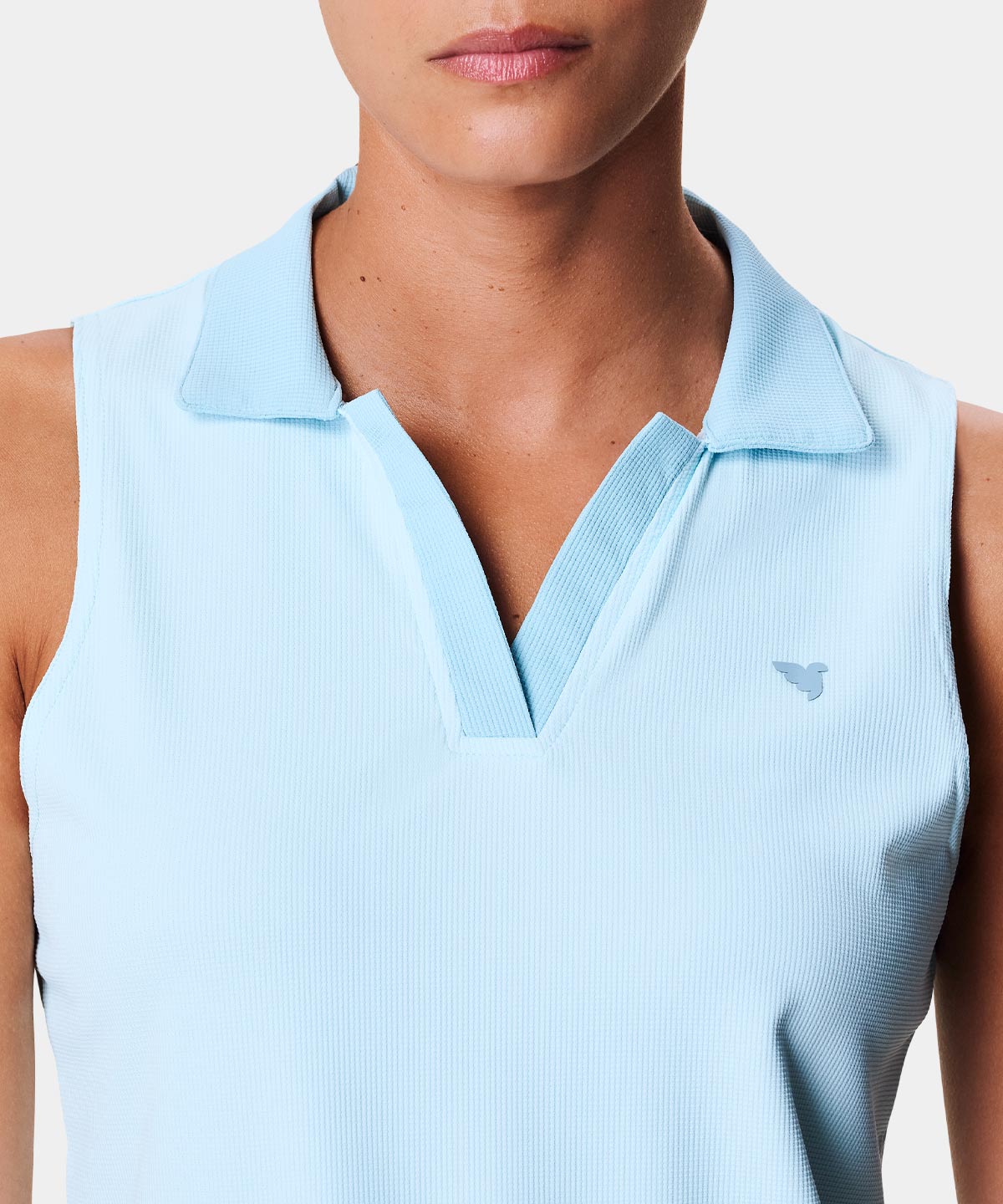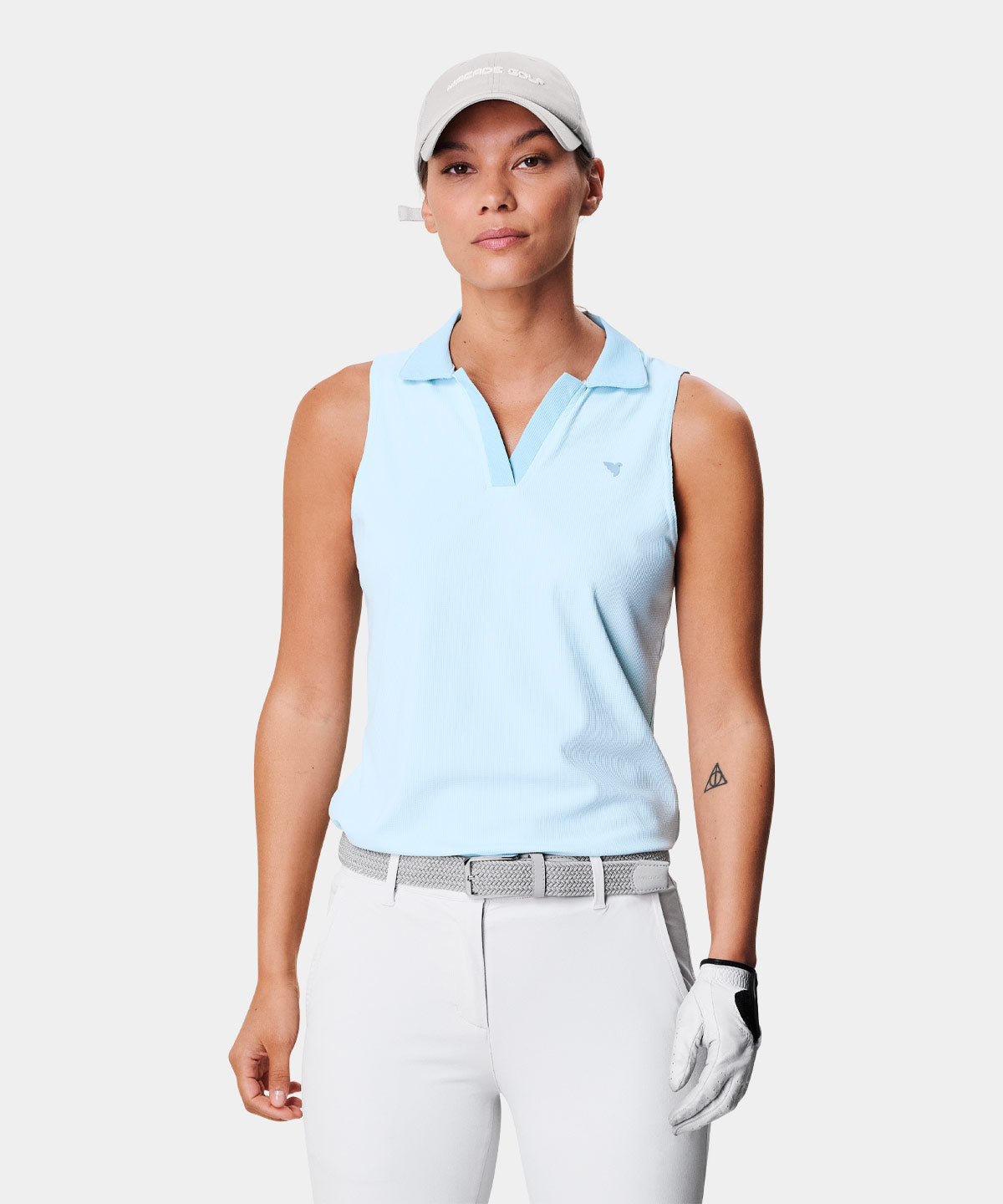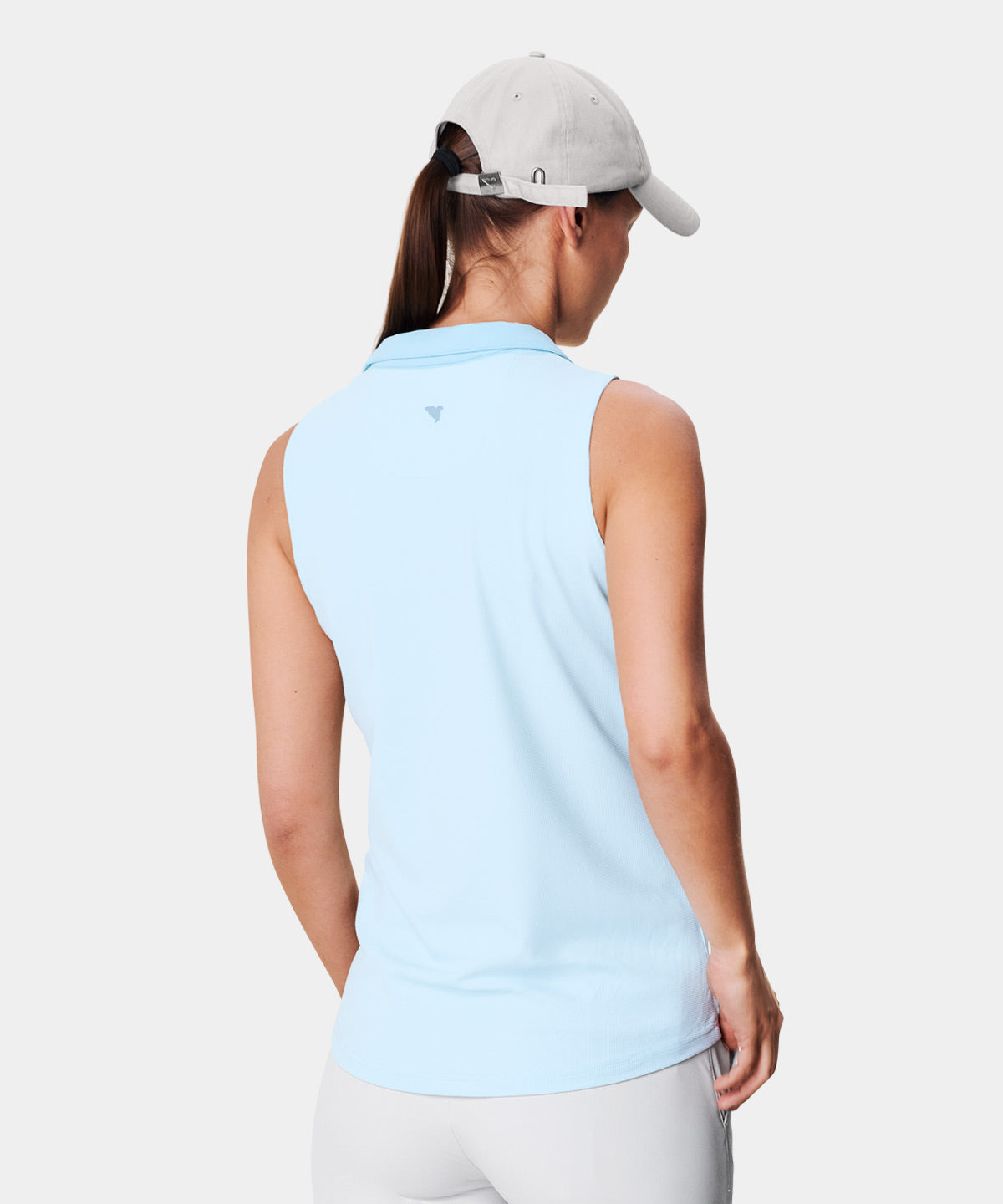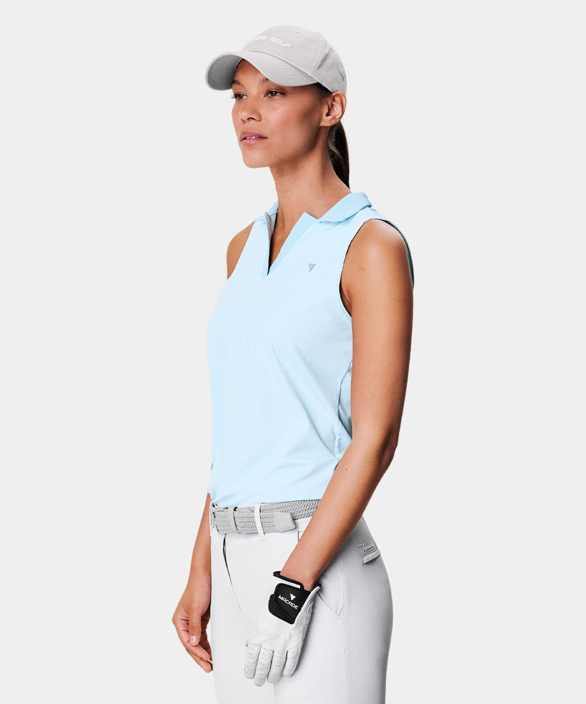 Ora Light Blue Sleeveless Shirt är en ärmlös tröja med öppen v-ringning. Ett utmärkt plagg för att hålla sig sval under sommarsäsongen på golfbanan.
