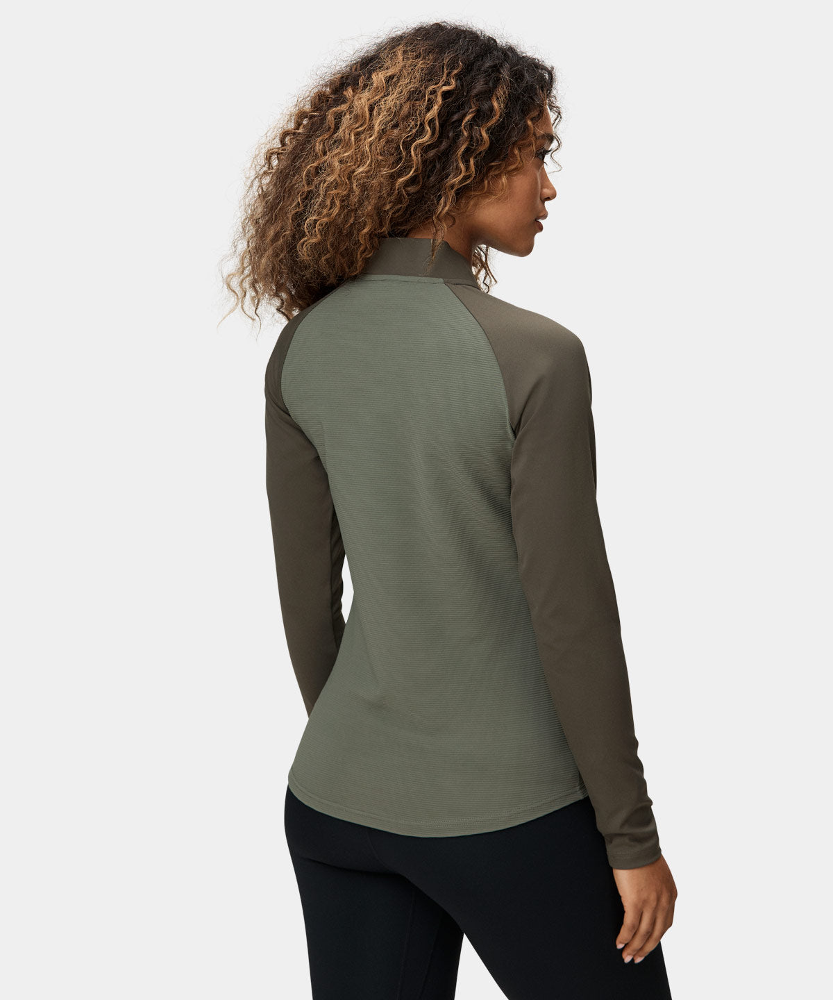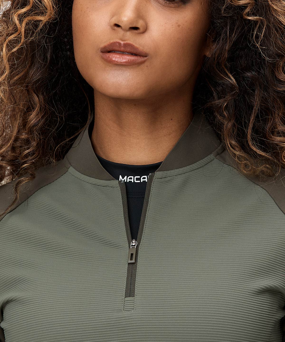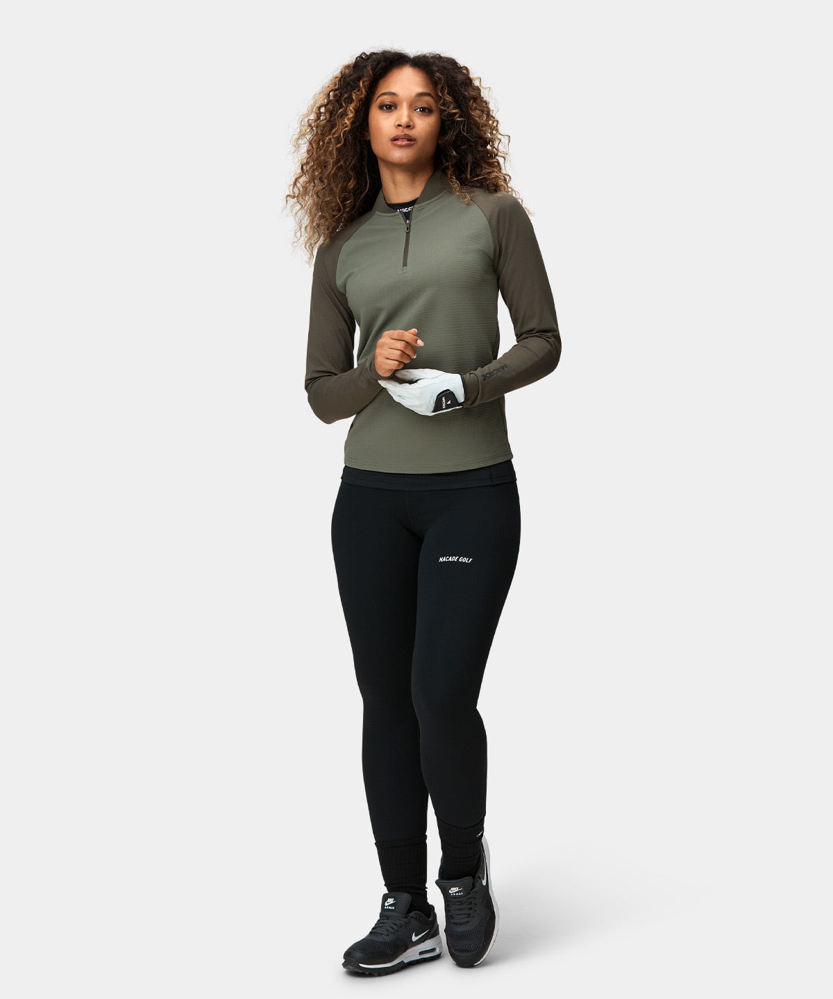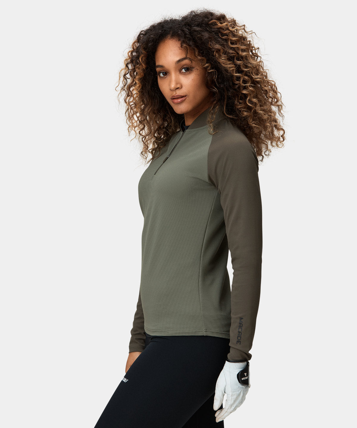 Olivgrön quarter-zip tröja med bomberkrage och ett subtilt ribbat mönster över kroppen. Ärmarna är sydda i raglanmodell vilket ger en superb rörelsefrihet. En överdragströja som fungerar utmärkt både på och utanför golfbanan.