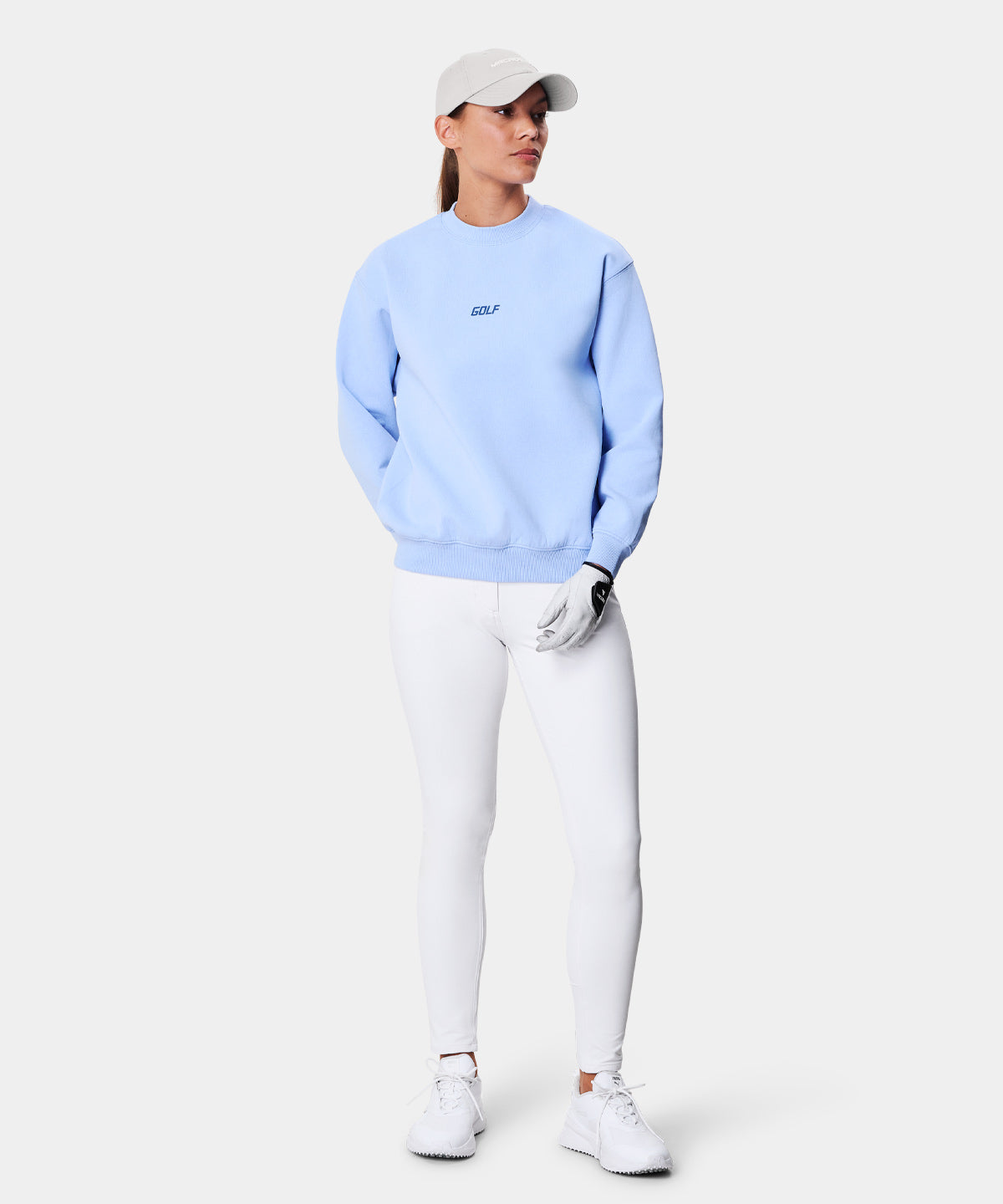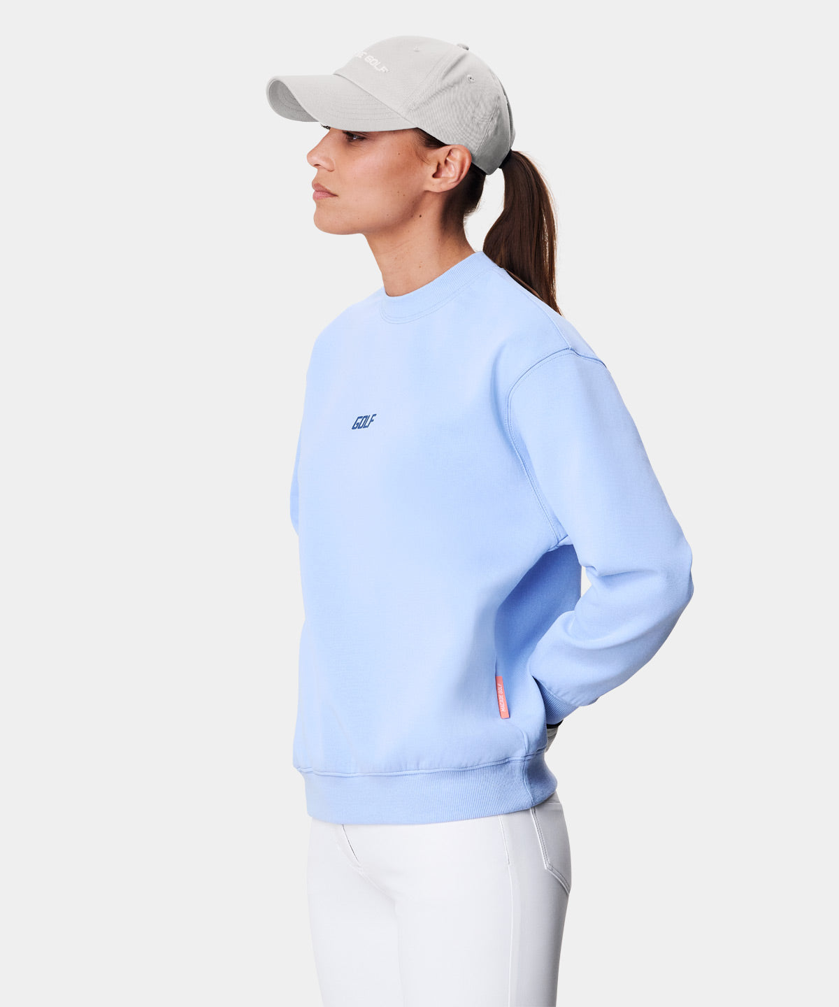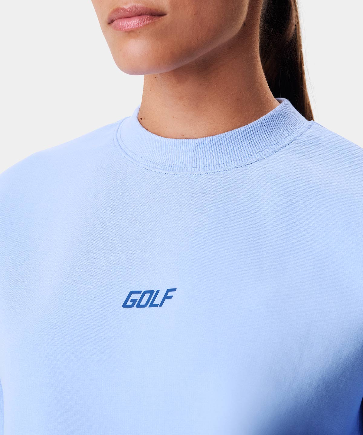 Powder Blue Oversized Pullover är ett skönt extralager för tidiga morgnar eller svala kvällar. Ljusblå tröja med mörkblått GOLF logotyp på bröstet.