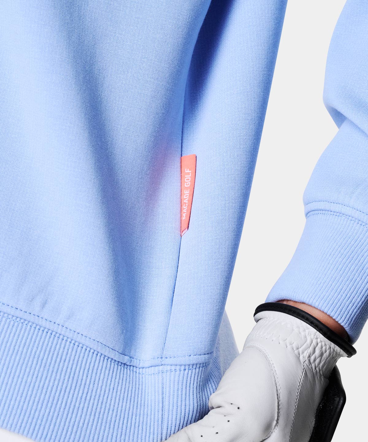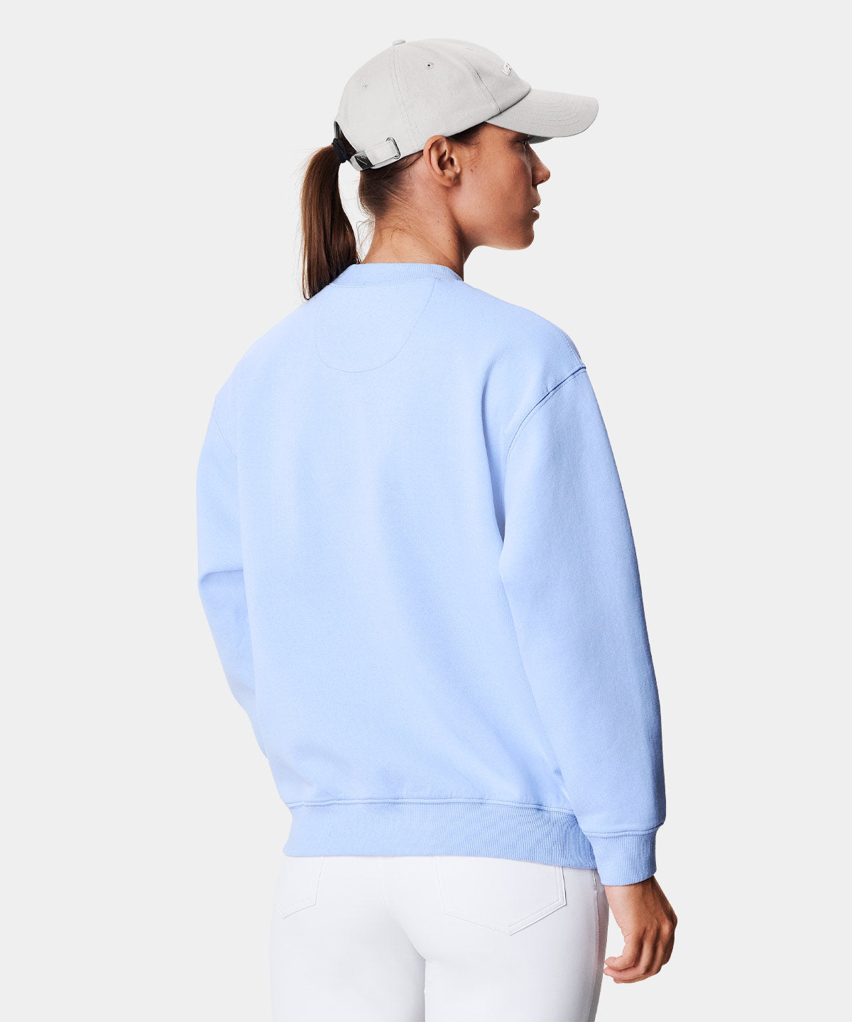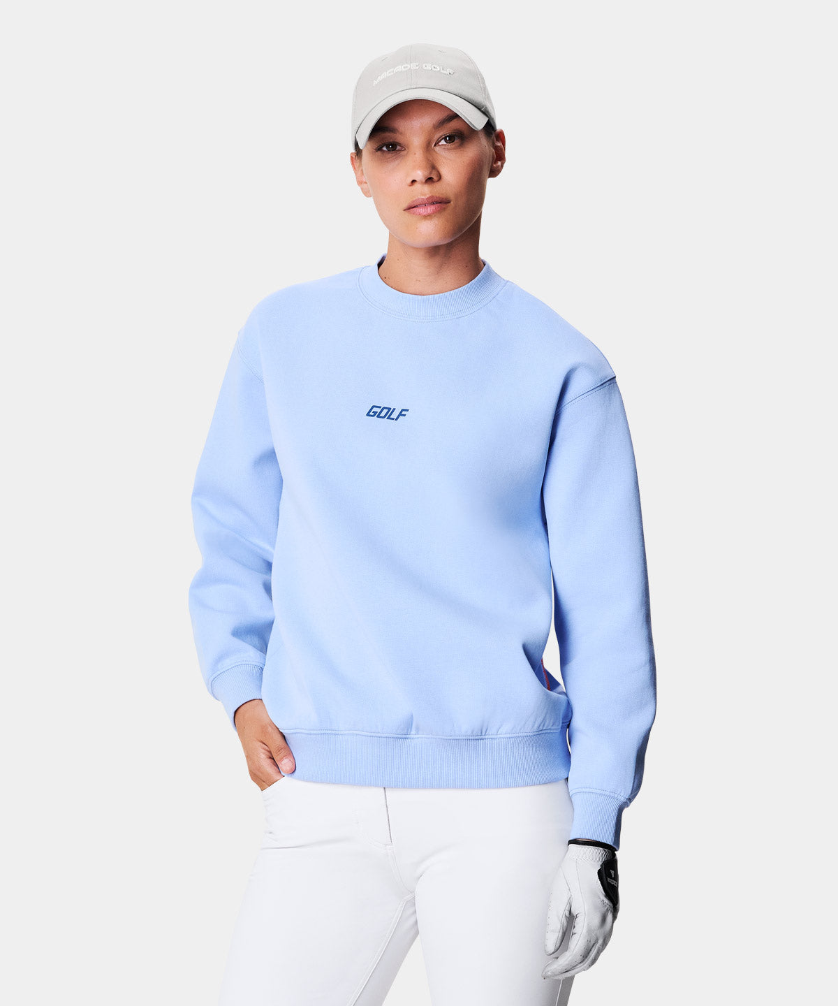 Powder Blue Oversized Pullover är ett skönt extralager för tidiga morgnar eller svala kvällar. Ljusblå tröja med mörkblått GOLF logotyp på bröstet.