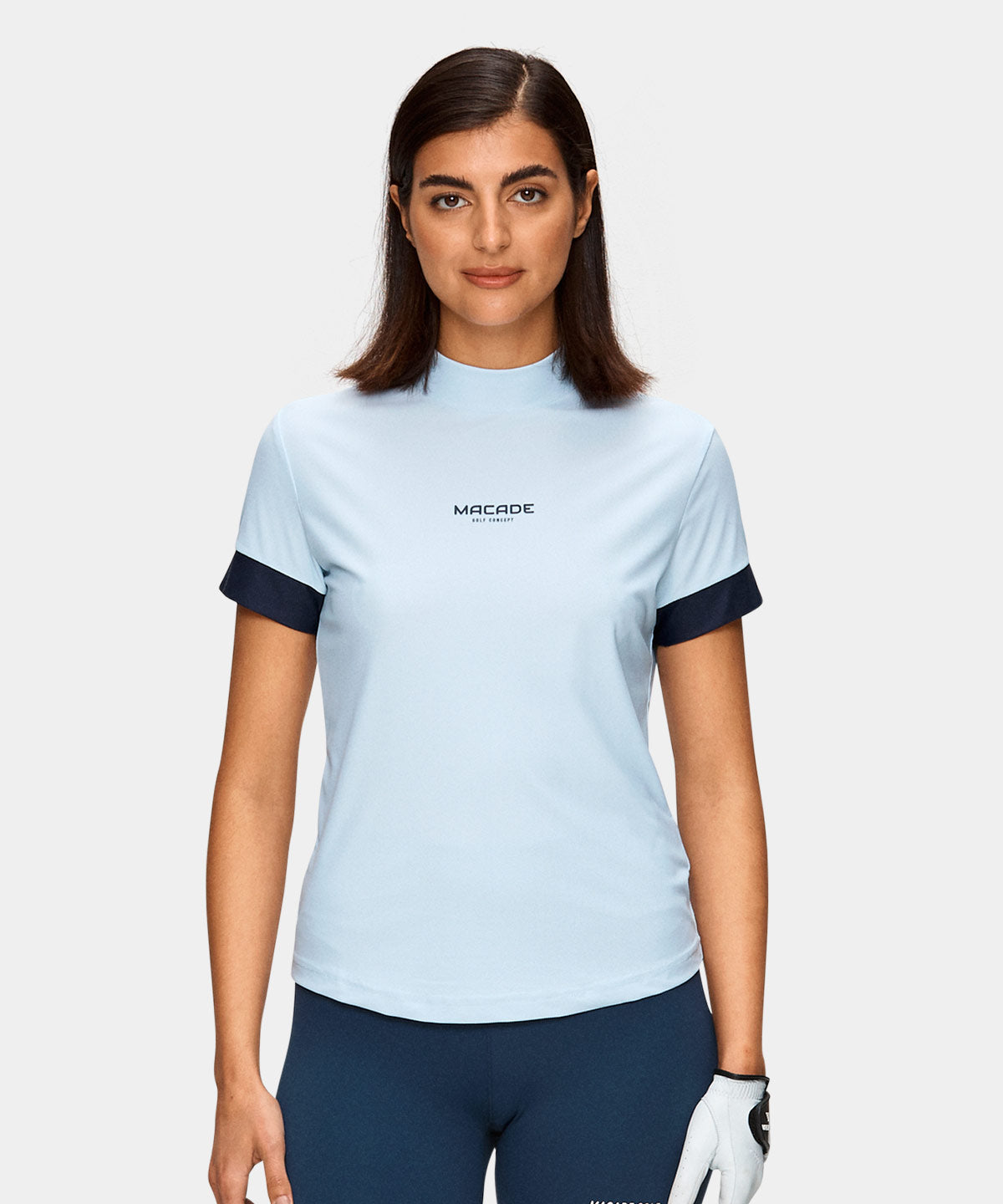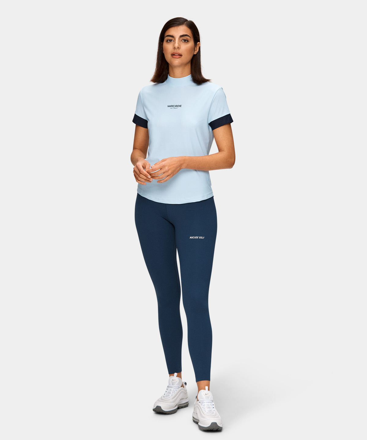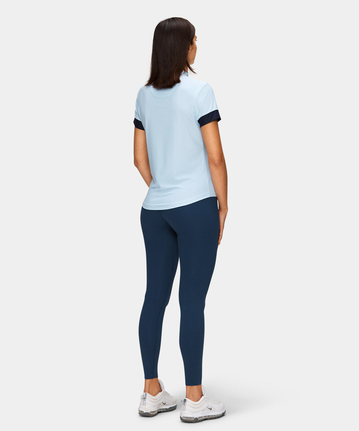 Ett modernt alternativ till den klassiska golfpikén. Denna ljusblå mock neck t-shirt har en något högre krage för en trendig och stilren look. De mörkblå, kontrasterande ärmöppningarna och logotryck ger t-shirten ett sportigt utryck. Matcha gärna med ett par blå eller grå leggings.