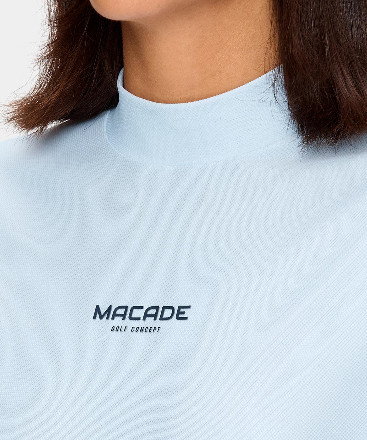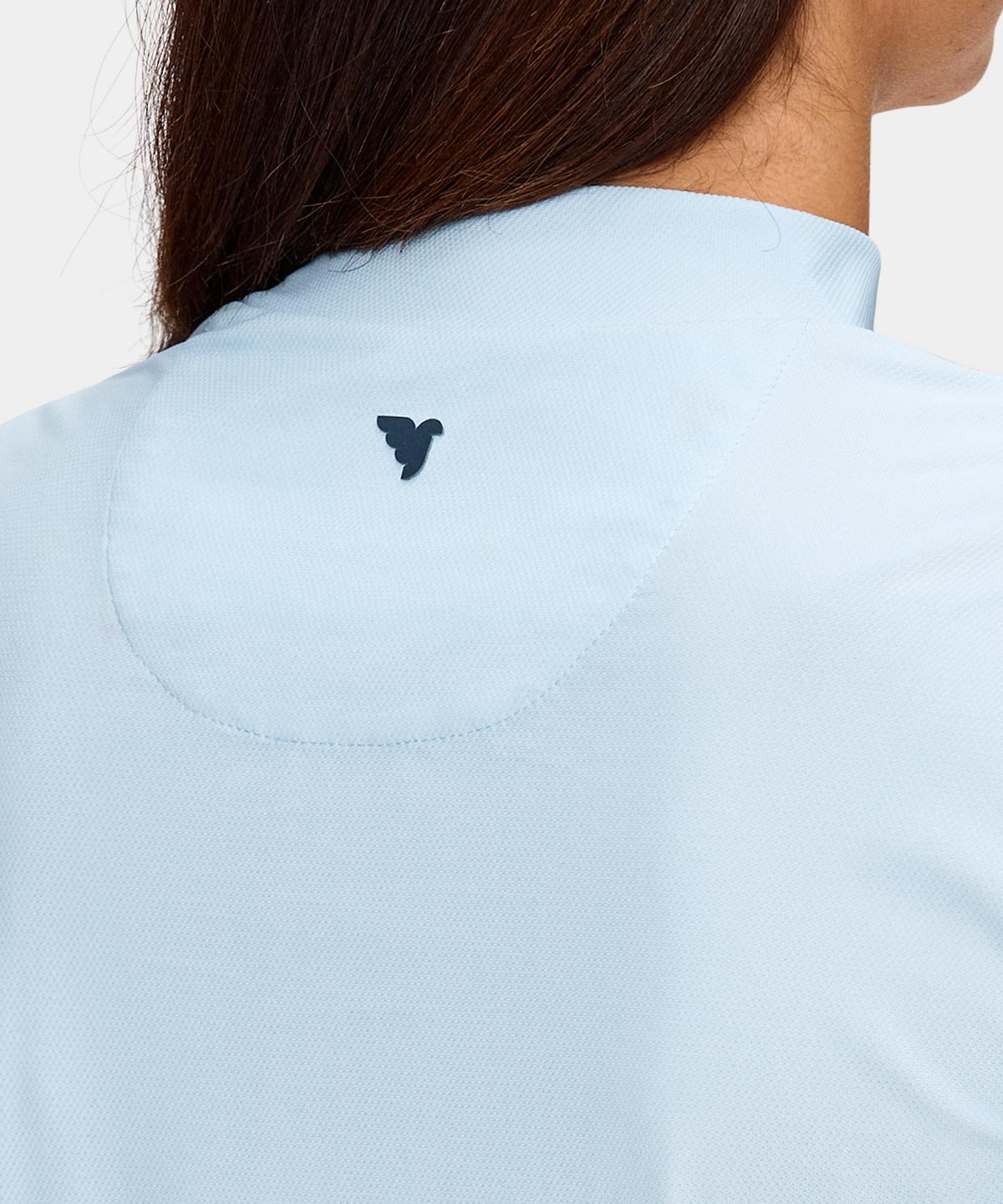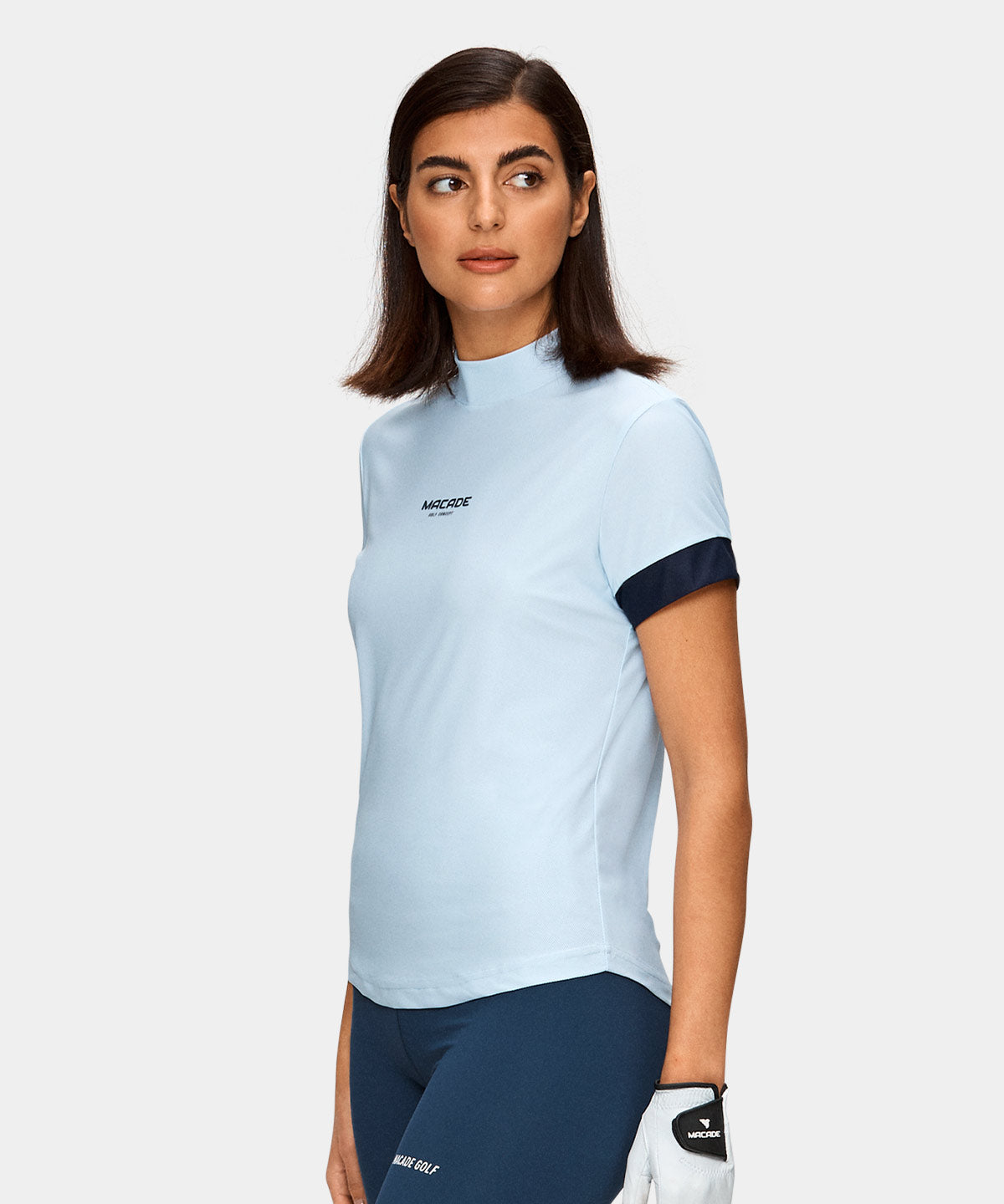 Ett modernt alternativ till den klassiska golfpikén. Denna ljusblå mock neck t-shirt har en något högre krage för en trendig och stilren look. De mörkblå, kontrasterande ärmöppningarna och logotryck ger t-shirten ett sportigt utryck. Matcha gärna med ett par blå eller grå leggings.