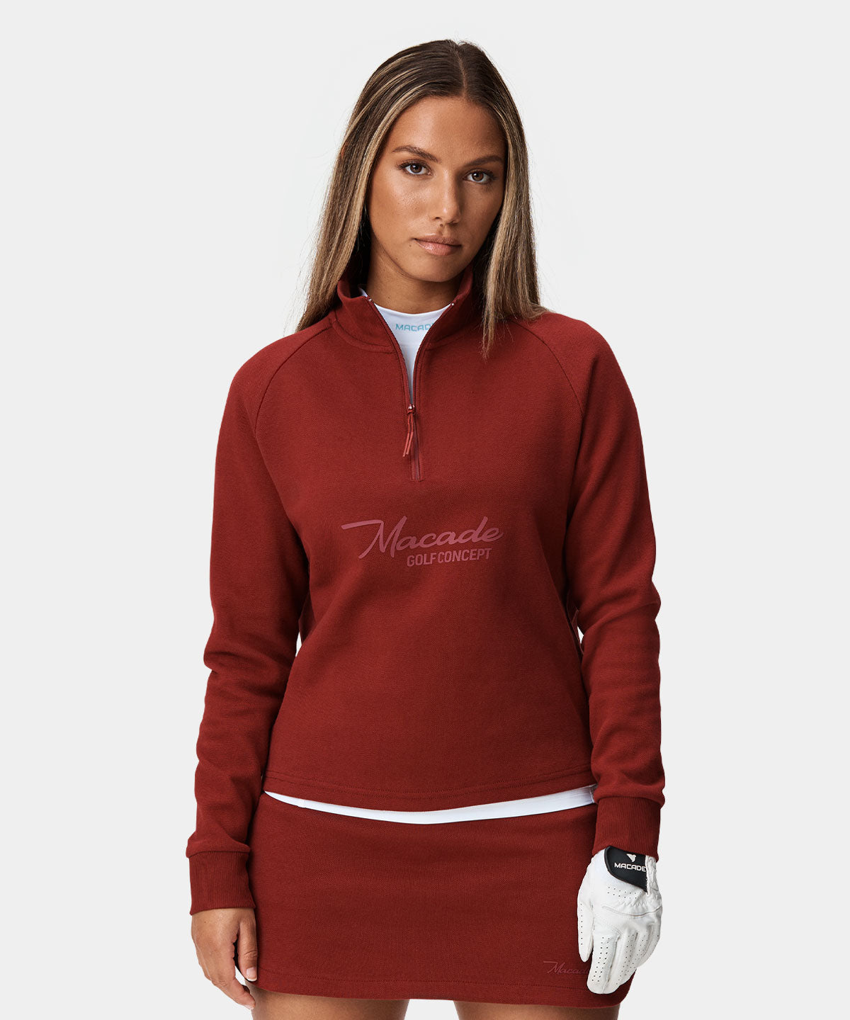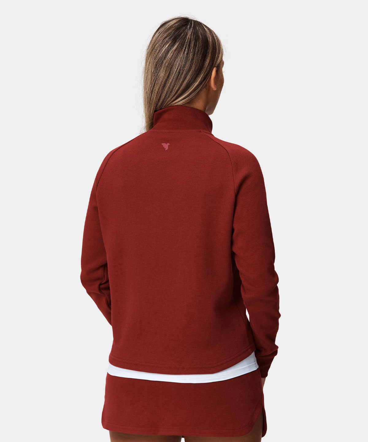 Denna röda quarter zip har en avslappnad och aningen croppad passform, perfekt för en dag på golfbanan. Den är tillverkad i ett heavyweight tech-pique material som ger tröjan ett snyggt fall och sportig look. Vita gummibaserade logotryck på bröst och i nacke. Addera kjolen ifrån samma kollektion för en komplett look.