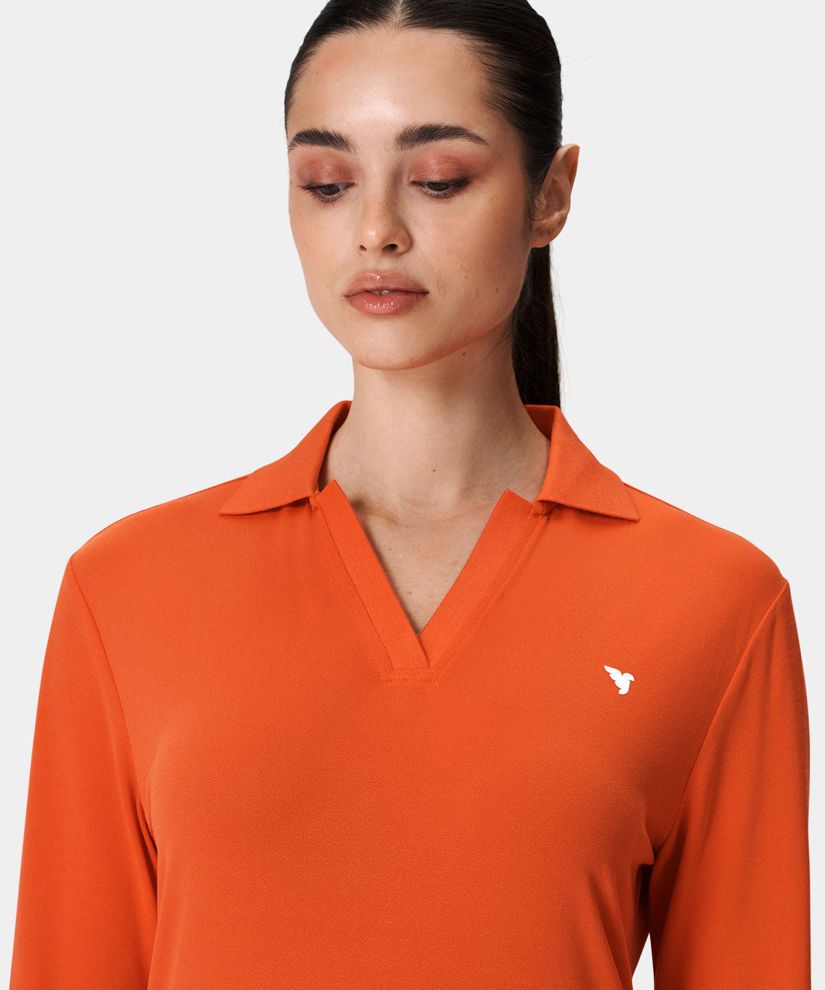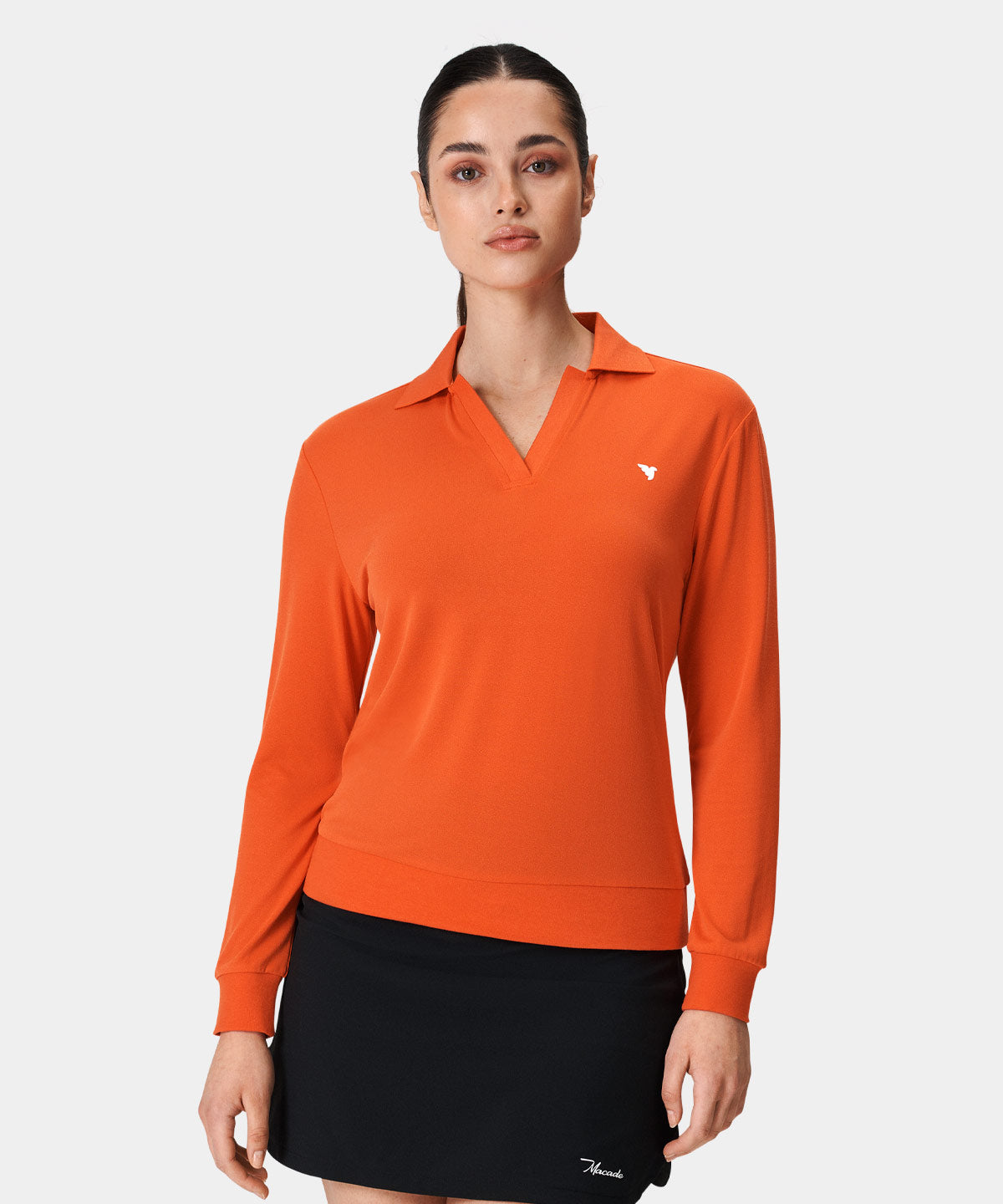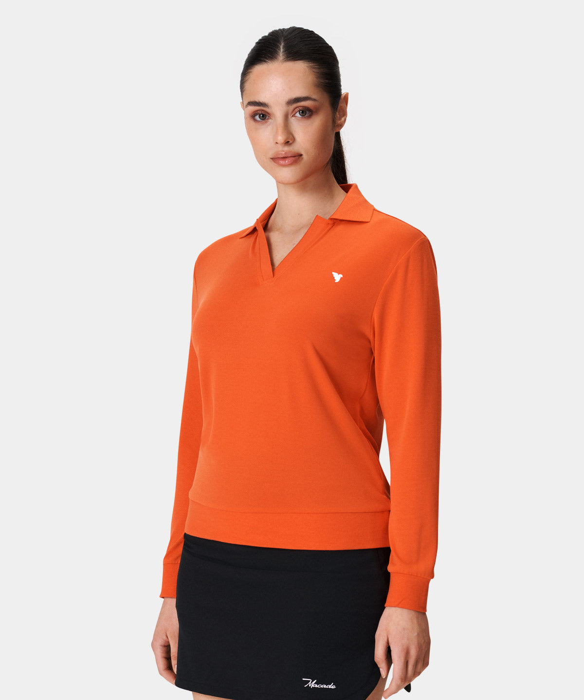 Den här röda långärmade pikén är gjord i ett mjukt och stretchigt tyg för att möjliggöra så hög andningsförmåga och rörelseförmåga som möjligt. Den knapplösa v-ringningen och det rundade avslutet ger pikén ett avslappnat utseende. Tyget är lite tjockare än vår Kate-serie men fortfarande med god andningsförmåga som ser till att du håller dig torr och bekväm hela rundan.