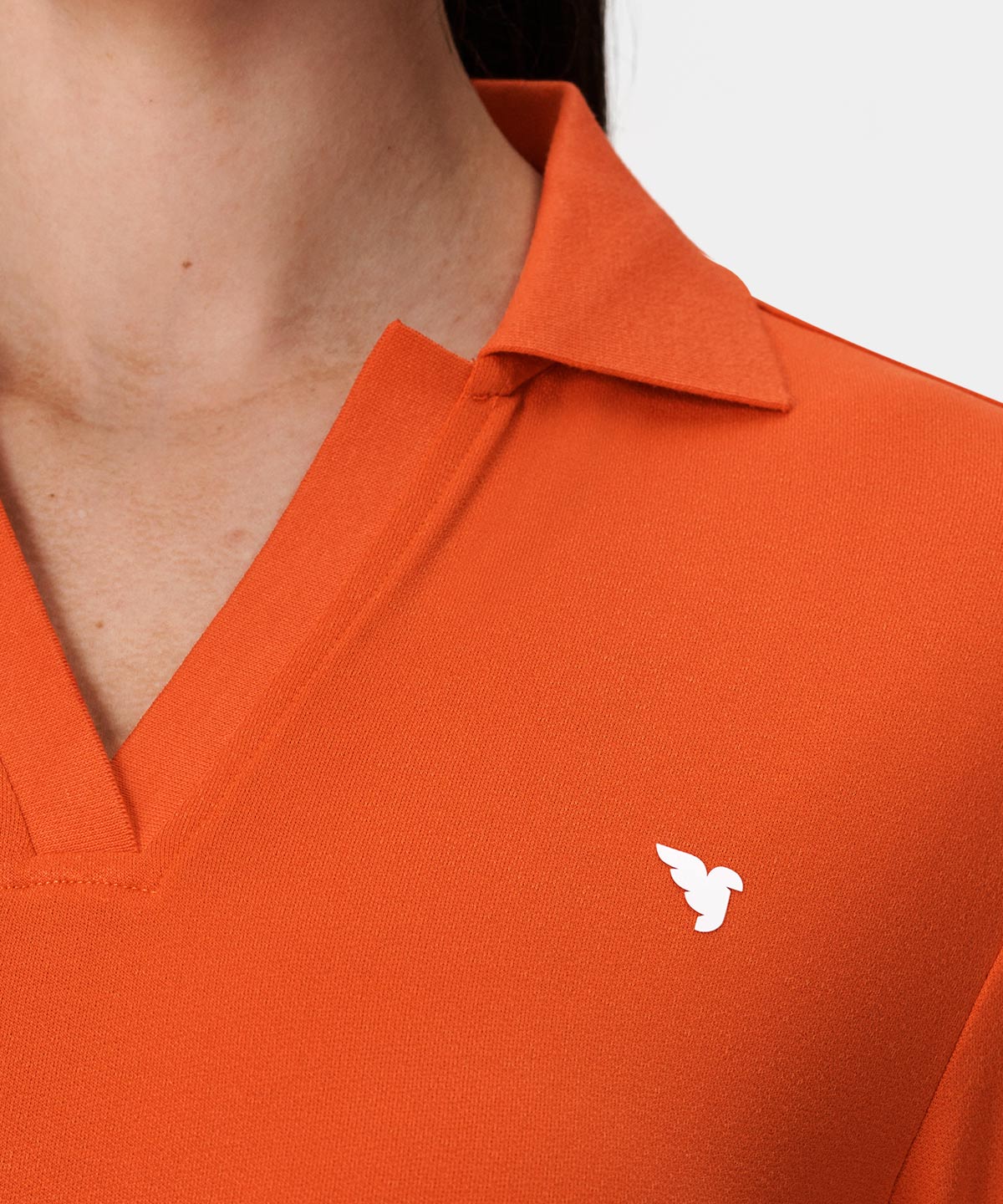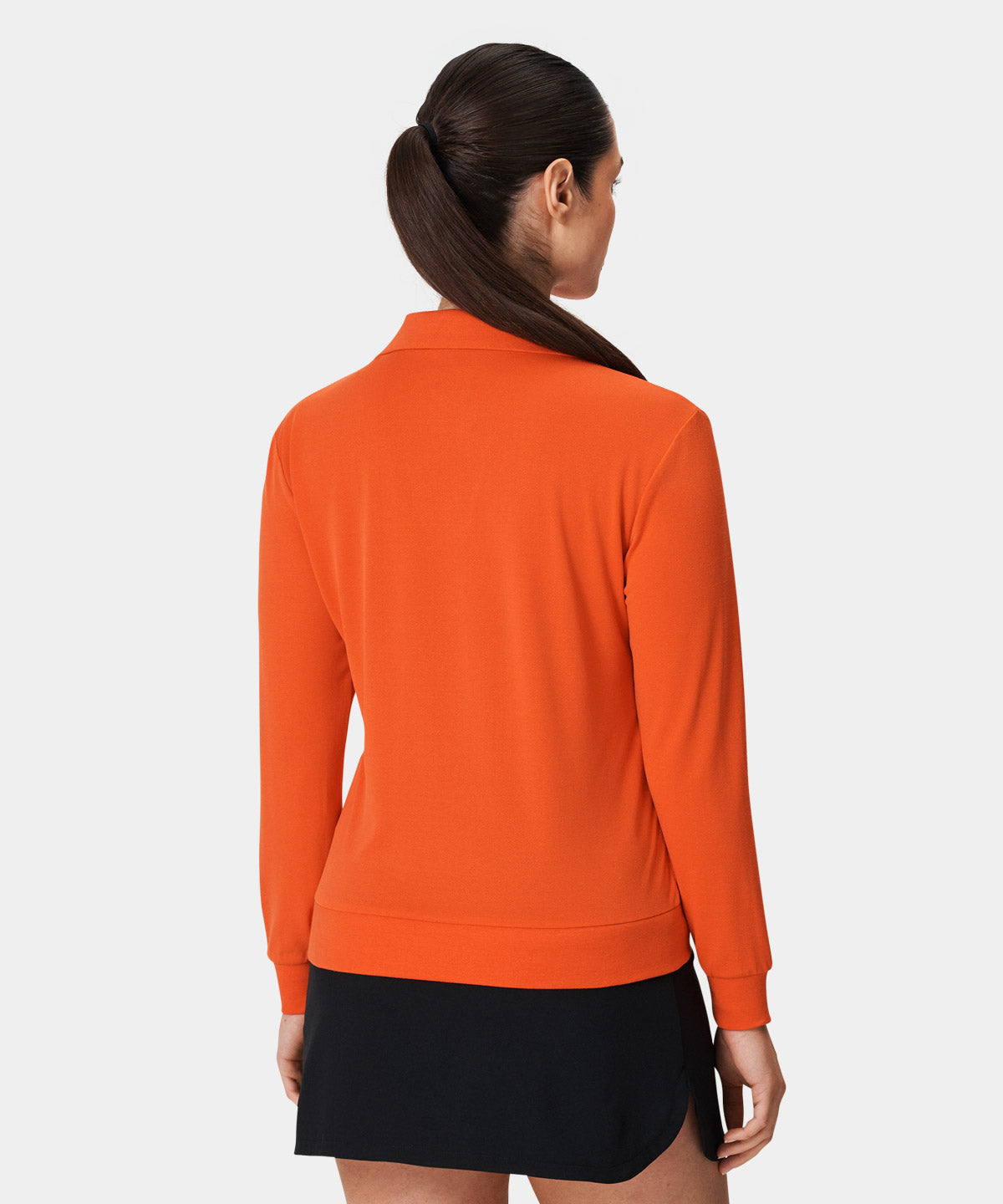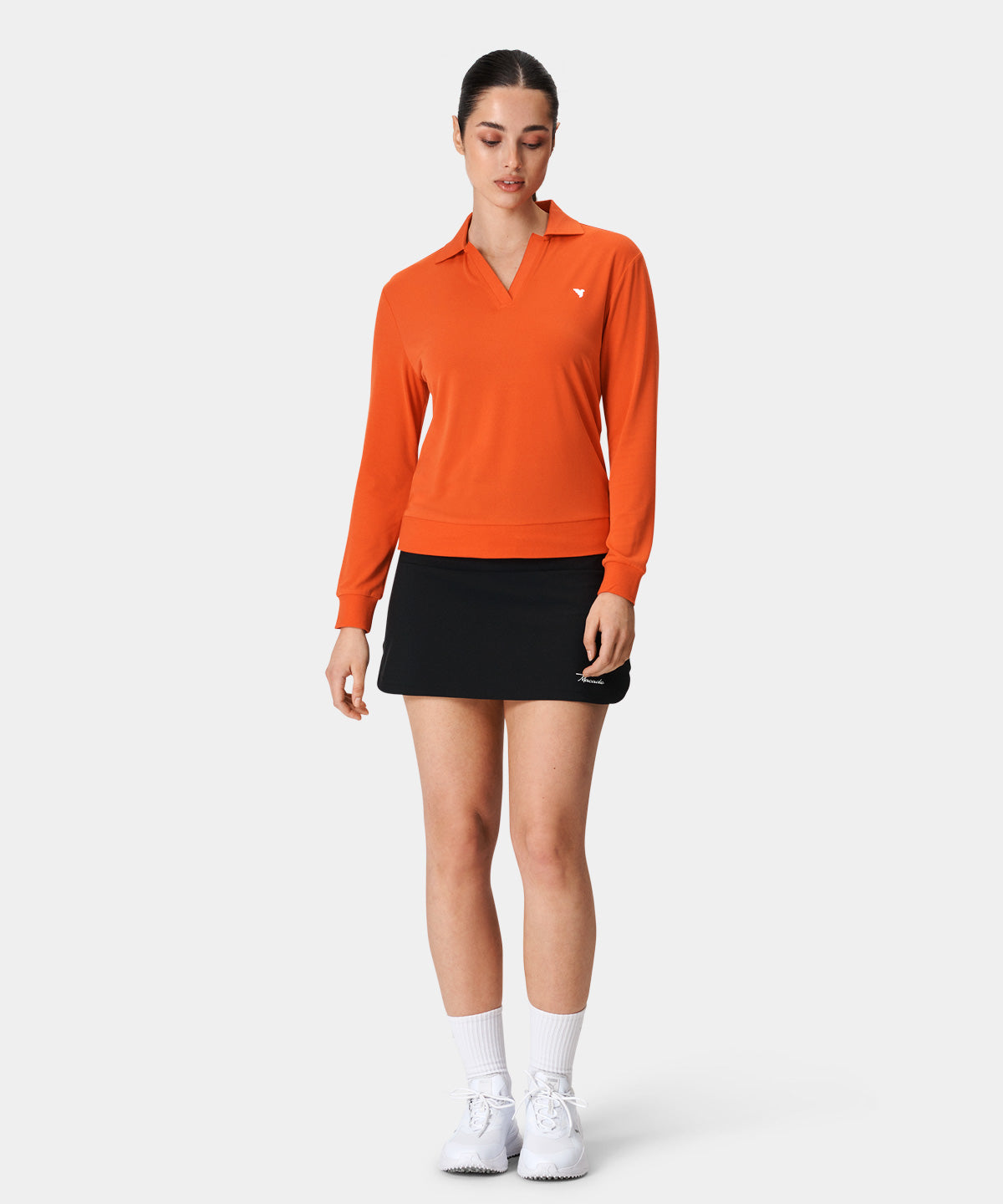Den här röda långärmade pikén är gjord i ett mjukt och stretchigt tyg för att möjliggöra så hög andningsförmåga och rörelseförmåga som möjligt. Den knapplösa v-ringningen och det rundade avslutet ger pikén ett avslappnat utseende. Tyget är lite tjockare än vår Kate-serie men fortfarande med god andningsförmåga som ser till att du håller dig torr och bekväm hela rundan.