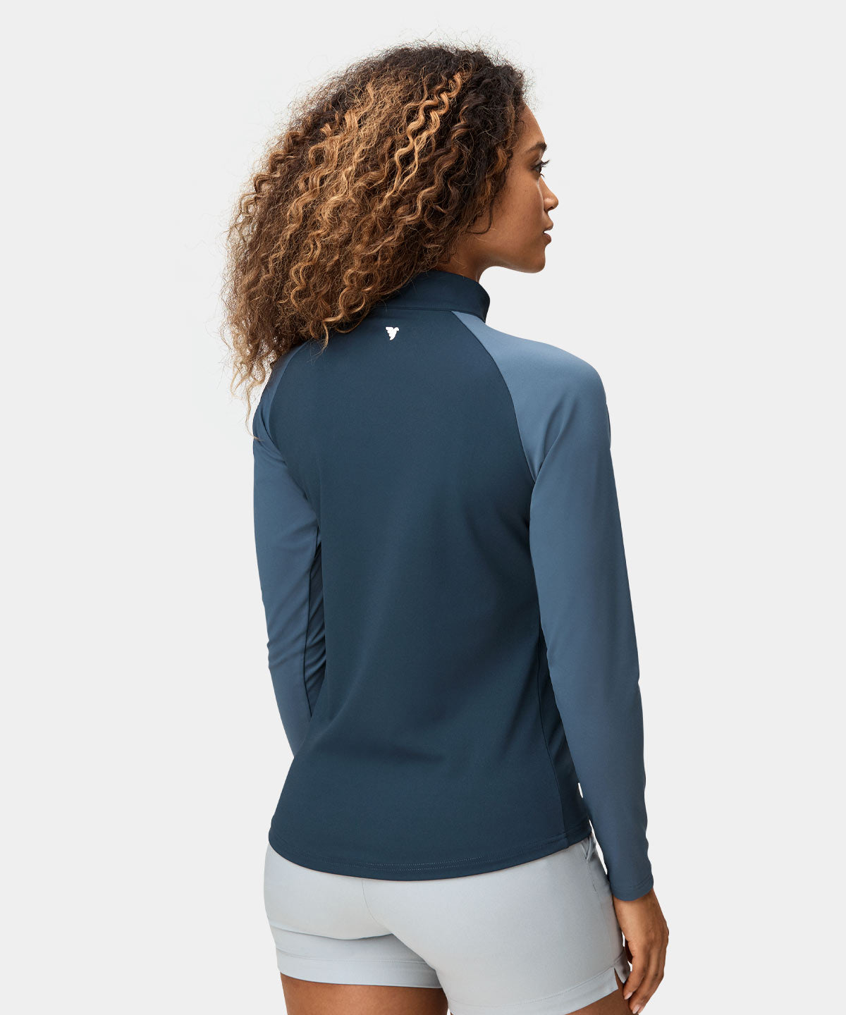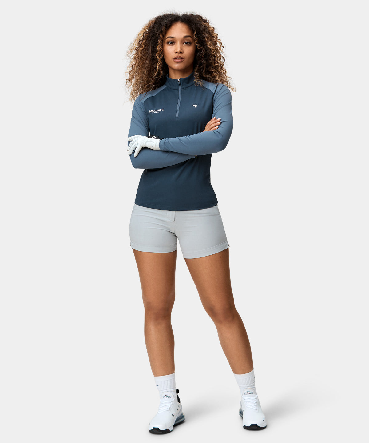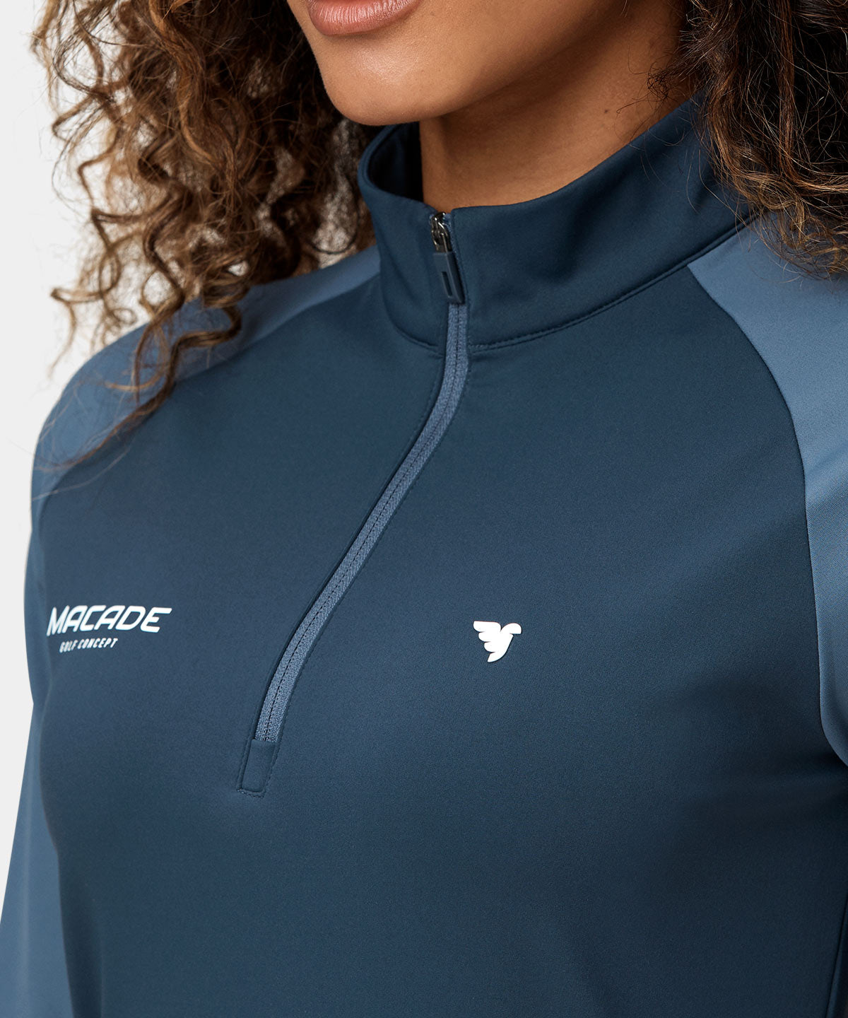 En solklar favorit denna sommar! Denna blå zip-tröja med låg ståkrage är tillverkad i ett bekvämt och följsamt material. Ärmarna är sydda i raglanmodell vilket ger en angenäm rörelsefrihet. En överdragströja som fungerar utmärkt både på och utanför banan.