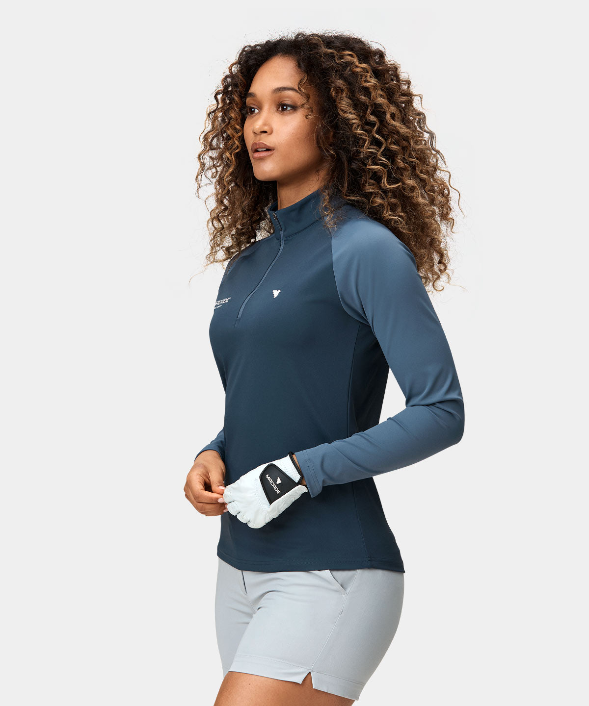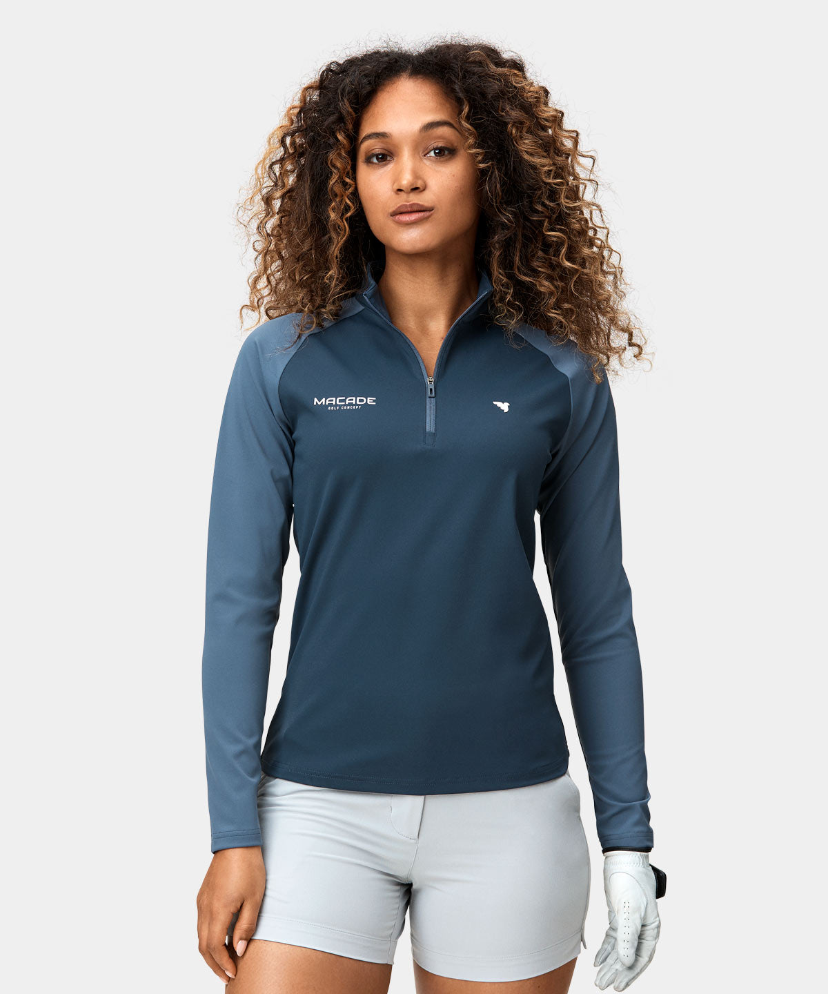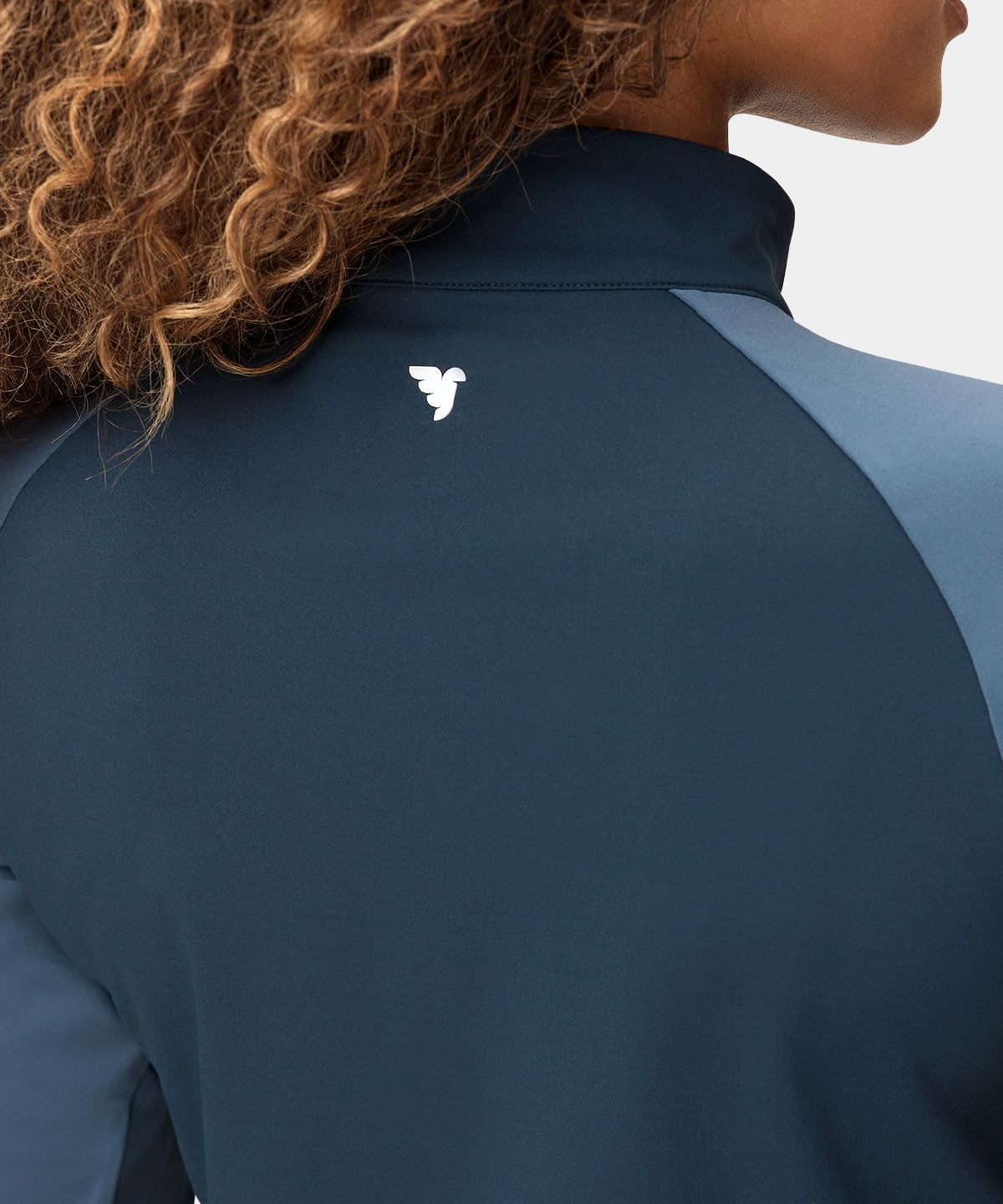 En solklar favorit denna sommar! Denna blå zip-tröja med låg ståkrage är tillverkad i ett bekvämt och följsamt material. Ärmarna är sydda i raglanmodell vilket ger en angenäm rörelsefrihet. En överdragströja som fungerar utmärkt både på och utanför banan.