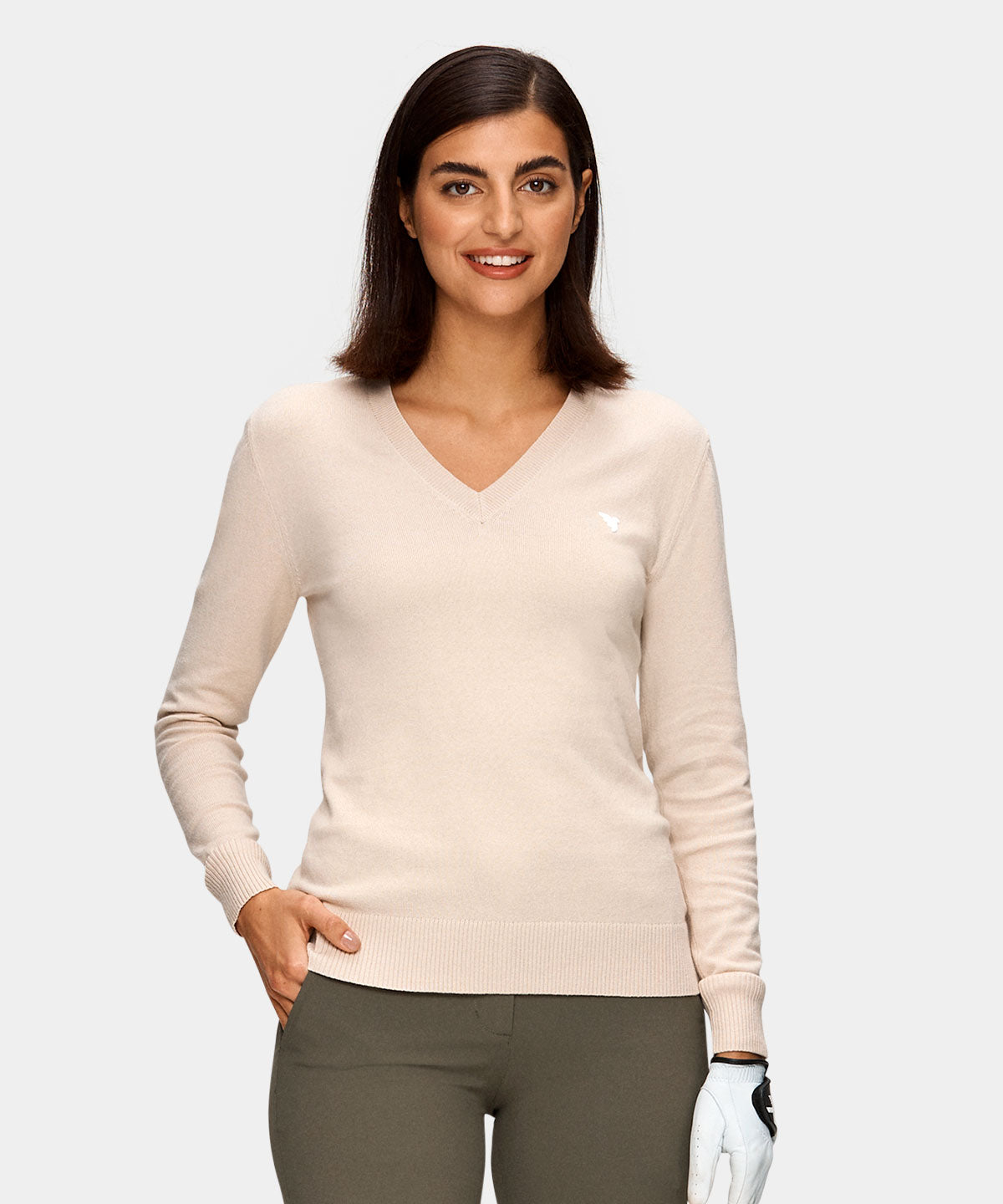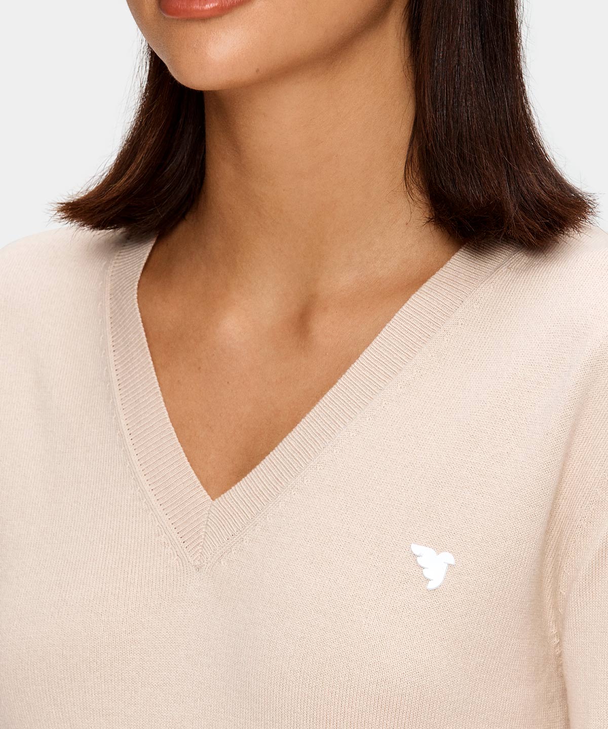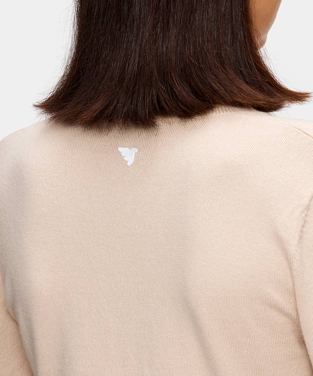 Beige mångsidig tröja stickad i en blandning av lätt borstad bomull och viskos, vilket gör den både exceptionellt mjuk och stretchig. Bär den under en tunn jacka varma höstdagar eller över en vit piké för en klassisk look. Utrustad med detaljer som subtila vita gummibaserade tryck och ribbade ärmslut.