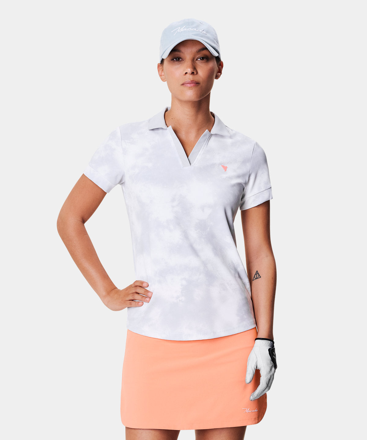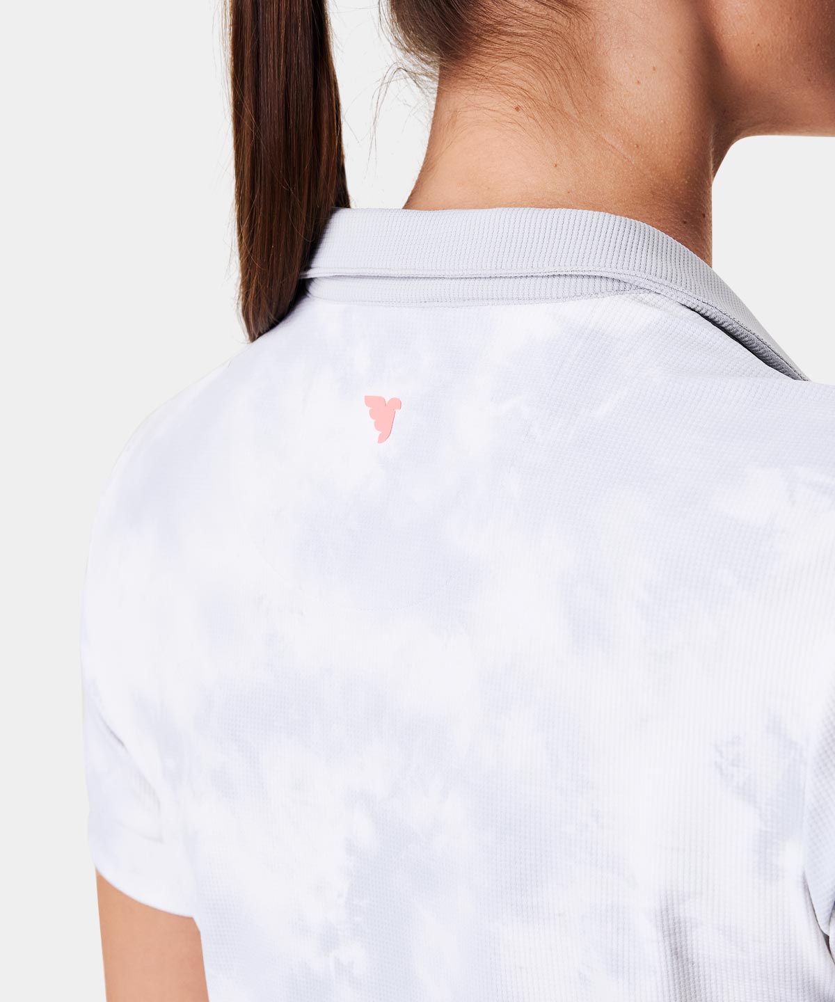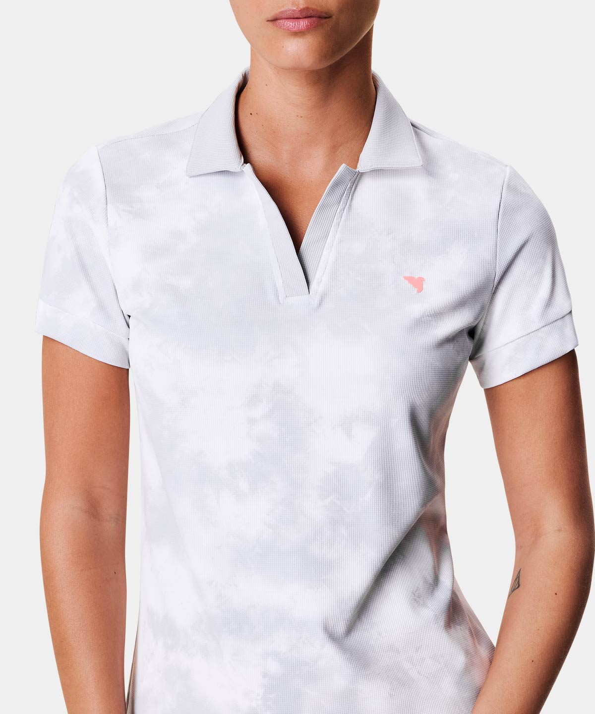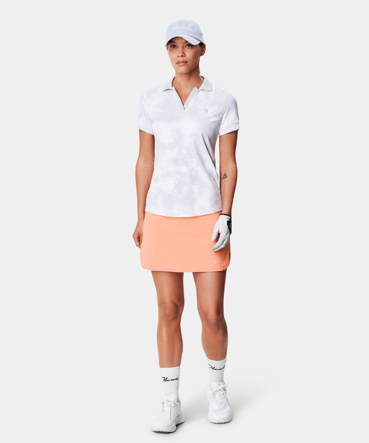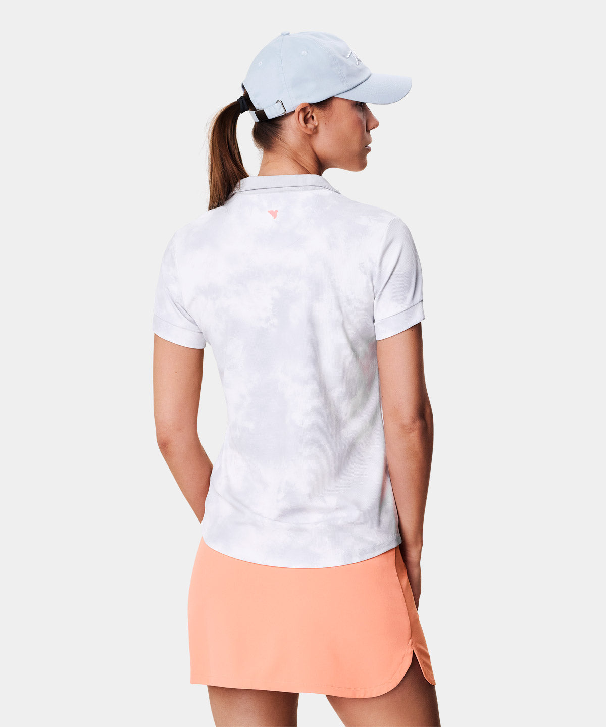 Tori Tie-Dye Polo Shirt är en ljus piké med en öppen knapplös v-ringning och kontrasterande peach-färgade logotyper.